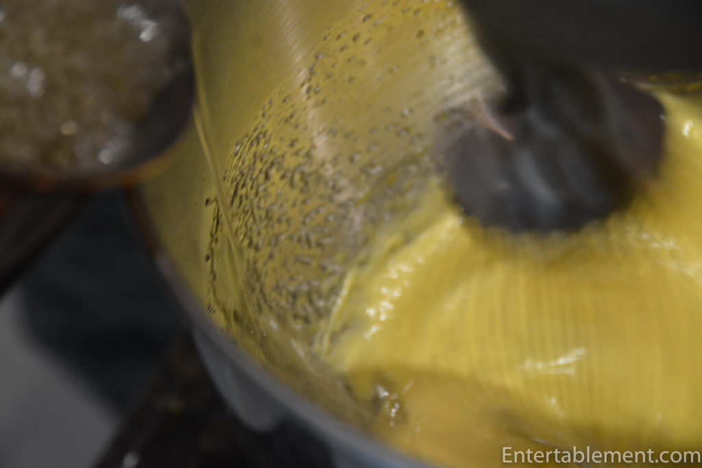 With the mixer running, she gently poured a thin stream of the heated sugar syrup into the egg yolks, cooking them as they whipped until they reached the correct consistency.
