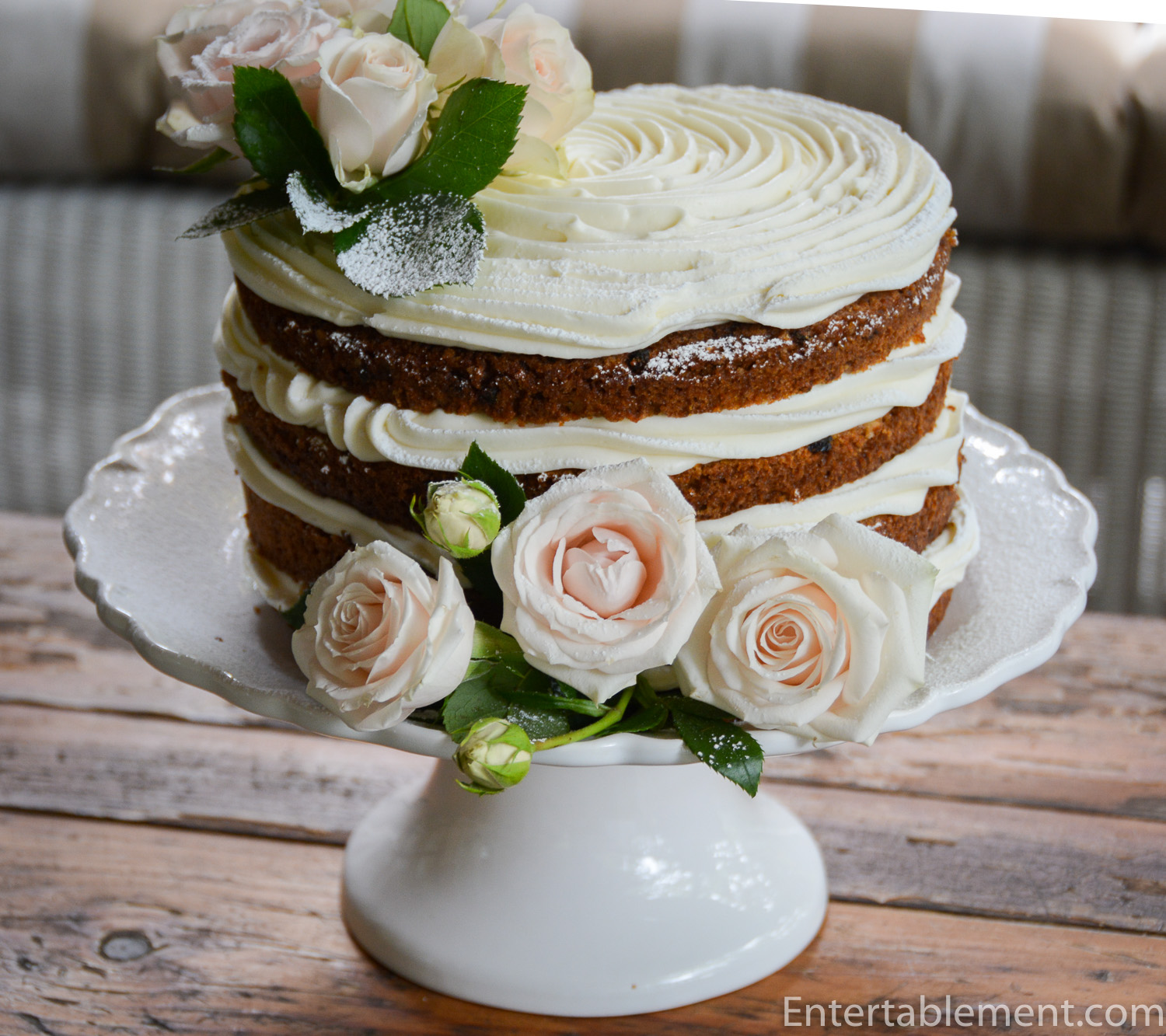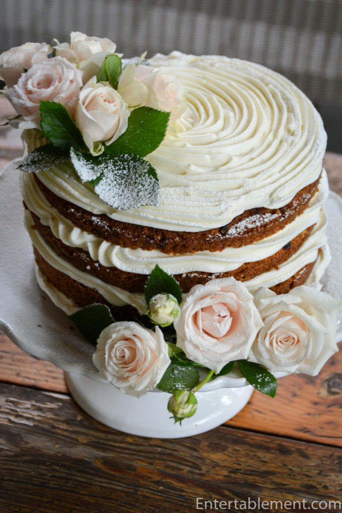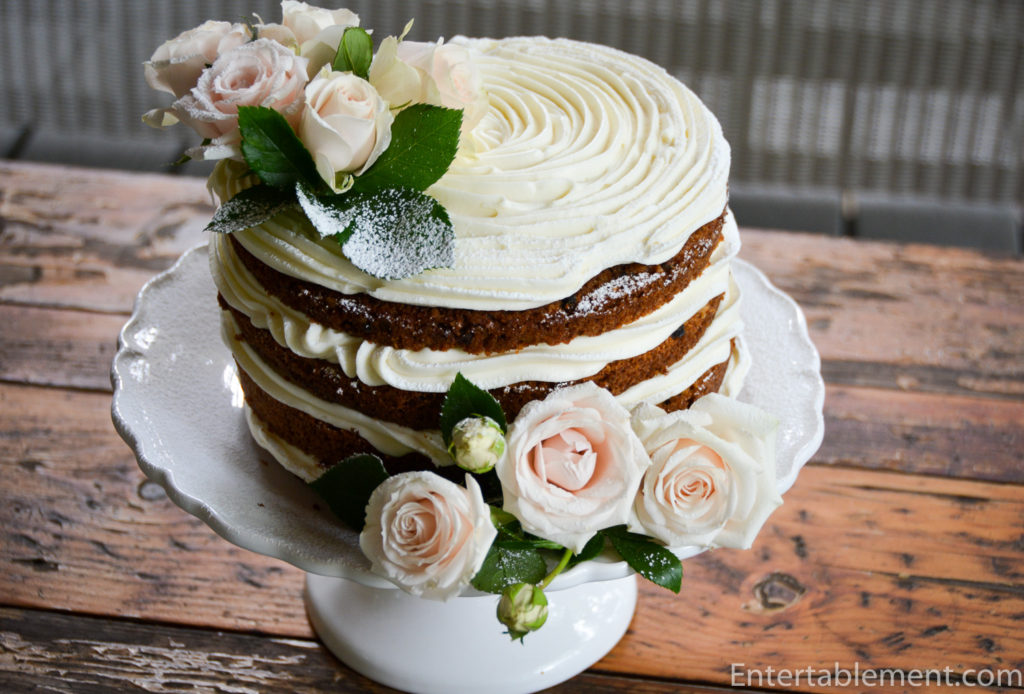 Once she had the four layers prepared, she piped cream cheese frosting onto each layer and assembled the four-layer cake, leaving the sides exposed. Then it went into the fridge to firm up overnight. Here it is in its final decorated state, complete with flowers and a dusting of icing sugar. We added the flowers at the very last minute, clipping the stems short and inserting them into pieces of a plastic straw, cut at an angle to make it easier to shove them into the cake.