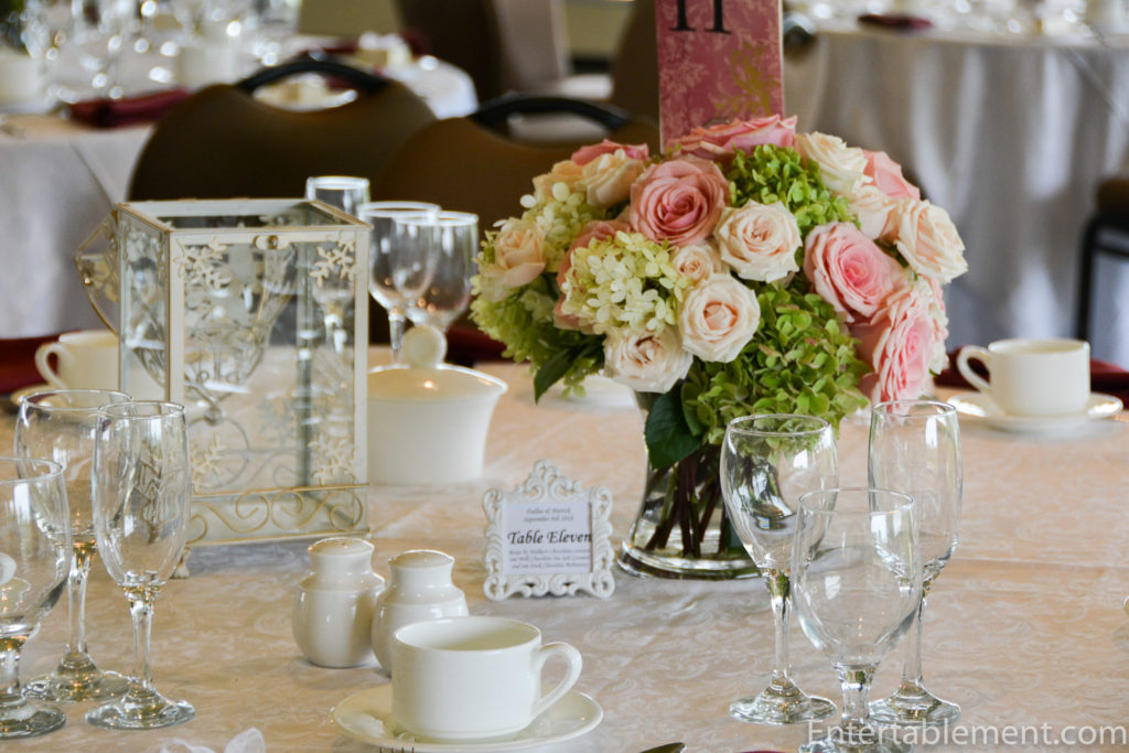 The branched roses went first, one in each quartered section and an extra in the middle. Then I added five of the large pink roses. The hydrangea —a combination of PeeGee, Endless Summer, and Annabelle —filled in the spaces. Then the final five roses were placed wherever they seemed to be called for. Not very scientific, and a professional would have a lot more to say about it (Hogarth lines and all that), but it worked.