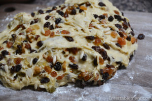 - Wash the dough hook and reattach it to the stand mixer. Transfer the dough to the mixer bowl and stir until deflated. Add all the raisins, candied citrus and nuts and mix to divide these evenly in the dough.