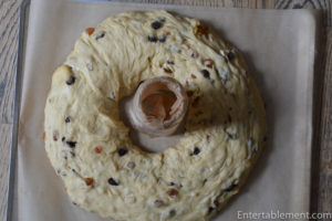 - Transfer the dough log to the baking tray and shape it into a circle, leaving a wide hole in the middle, attaching the ends of the log (the dough is sticky so it will form a circle easily). Put the lined cookie cutter in the middle of the circle so the bread doesn’t close in the center as it bakes. Cover with a clean tea towel and allow to rise in a warm, draft-free place for 30 minutes or until double in size.