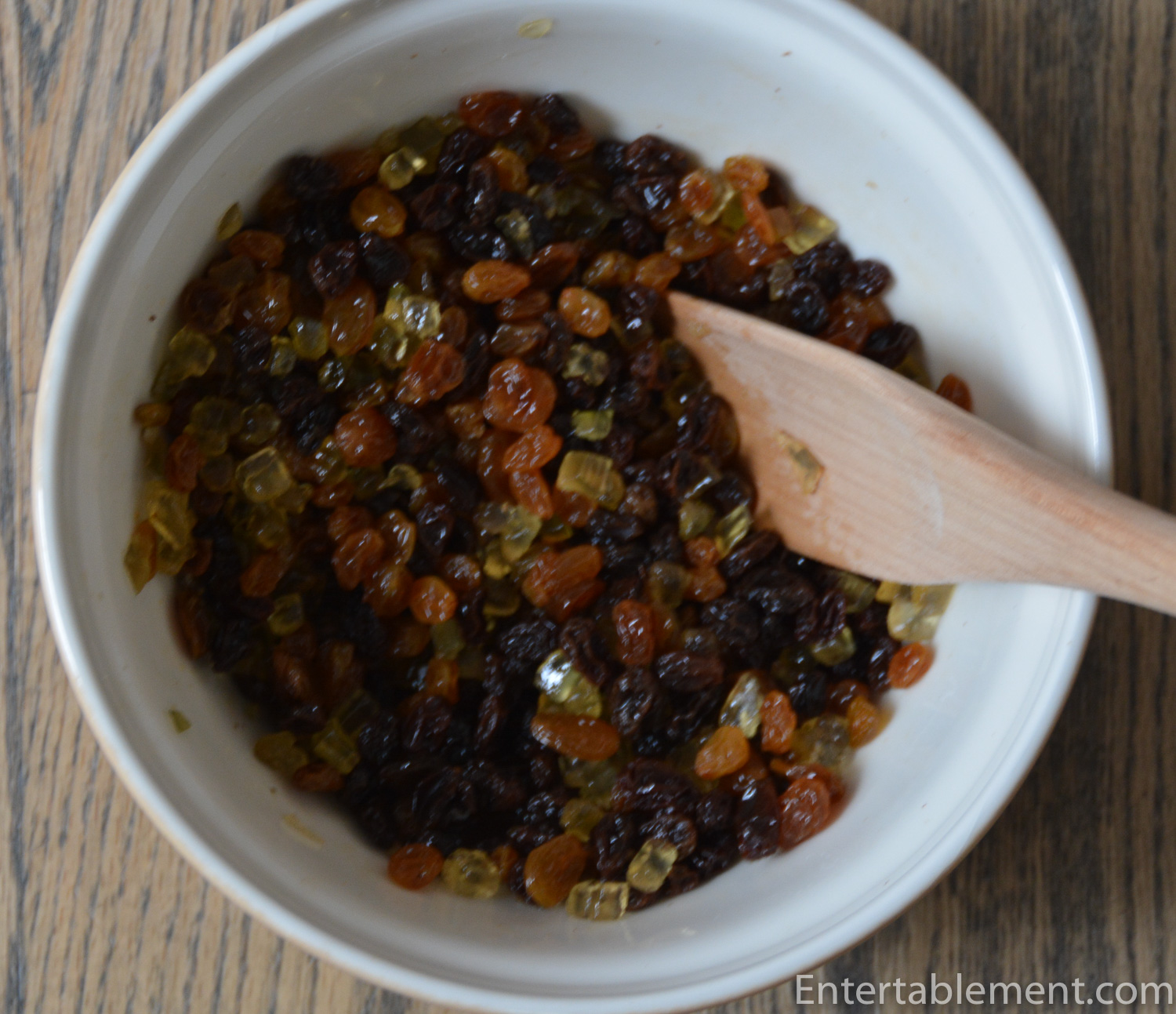 - Soak the raisins in the brandy overnight or heat the mixture in the microwave for 60 seconds, cover with plastic wrap and set aside.