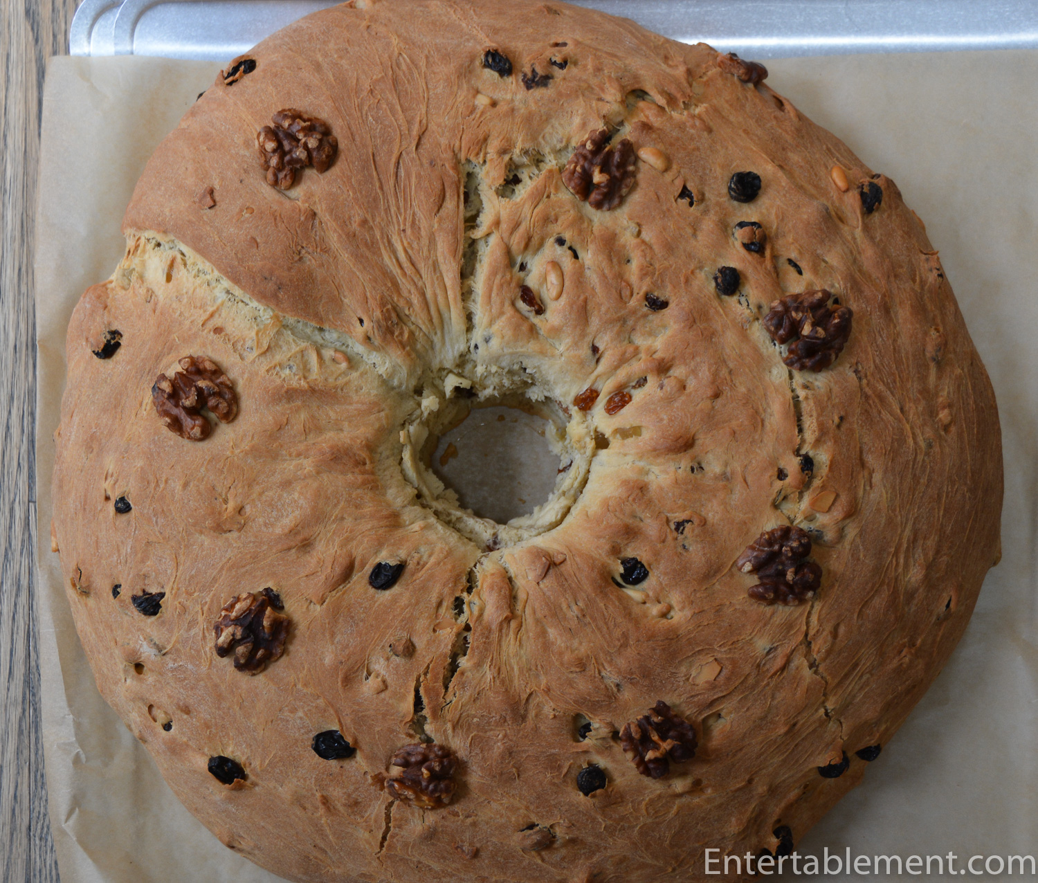 - Centre a rack in the oven and pre-heat the oven to 350º F. Decorate the bread with the halved walnuts and bake for 40 minutes. Remove the cookie cutter or jar from the center and continue baking another 10 to 15 minutes until golden brown and it sounds hollow when you tap on it.
