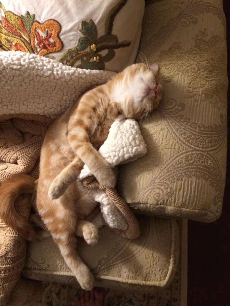 I have a hard time staying focused myself with that little scamp around! He’s good for what ails you, no matter how frustrating the day. He has taken to plonking himself right in between us at night, not budging until morning, regardless of how many times we turn over. Occasionally he comes further up the bed, purring like a jet engine, and then the tenor of the purring changes just a stick as he prepares to bite my nose. I’m instwntly alert now for that slight tremor in the purr. What possesses him, I have no idea. Pay Attention To Me!