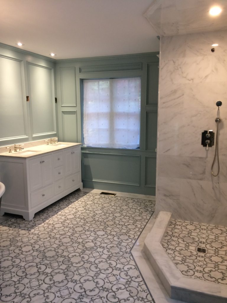 We’re back home in Canada now, still wending our way through contractor’s drop sheets, but definitely down to the short strokes. The closet people finish today (a chorus of heavenly hosts sing Alleluia). The ensuite awaits an elusive plumbing part and the glass for the shower stall. The electricians are reputed to be returning today (fingers crossed) to finish installing the sconces. Impatient, they departed yesterday while one of their colleagues was cutting the freshly painted wood panelling to accommodate the gem junction boxes for the sconces. You can see the holes in the panelling over the vanity Had I realized what was happening, I might have tied them to the porch railing rather than let them leave before the job was finished – just kidding, sort of…