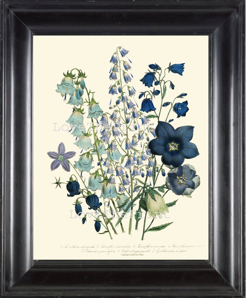 The reproduction Loudon Botanical prints are from Love The Print. They’re 11 x 14″, and being a bit more formal in nature, would likely look better with a generous matting. We could take the frames out to 19″ x 20″, so the overall picture would be similar to the Vogue prints. Here is one of them with mostly blue flowers.