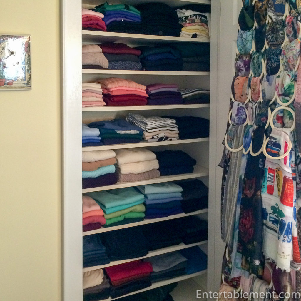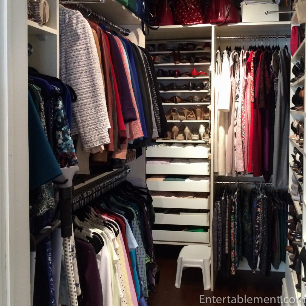 The closet was much simpler. I ordered three rolling clothes racks from Amazon and that dealt with all the hanging items. Shoes went into banker’s boxes and plastic containers. I lined up the purses on the floor of the spare room and put sweaters, jeans, etc. in piles on the bed. Done.