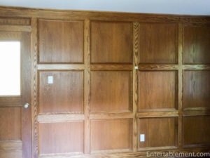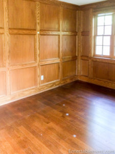 I spent a long time researching the wall sconces, as the junction boxes had to be small enough to fit into the 4″ wide strips of vertically raised panelling. These are “gem box” sconces, and I ordered small square shades. The sconce on the far right side will butt up almost against the wall. I’ll put two mirrors between the three sconces.