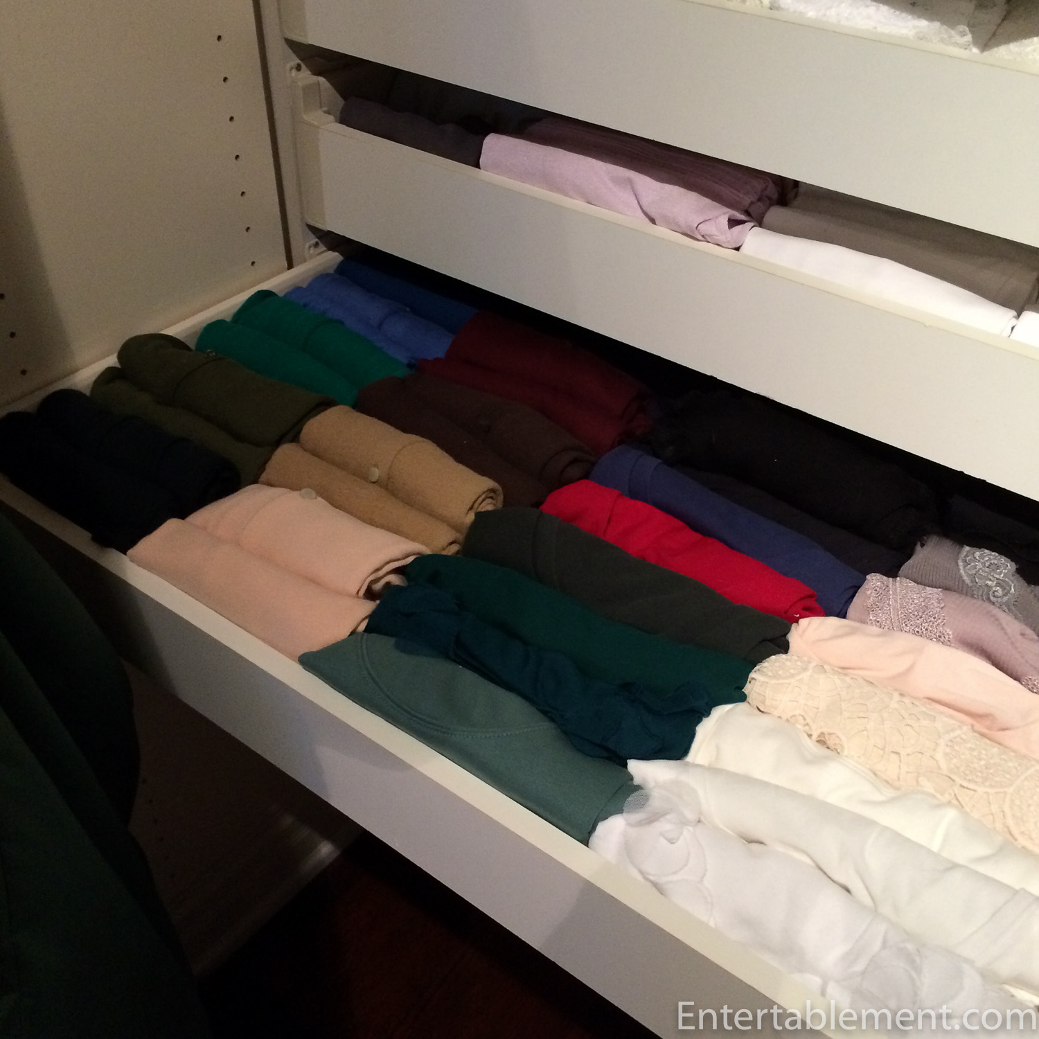 I used the drawers to house t-shirts, underpinnings and unmentionables.