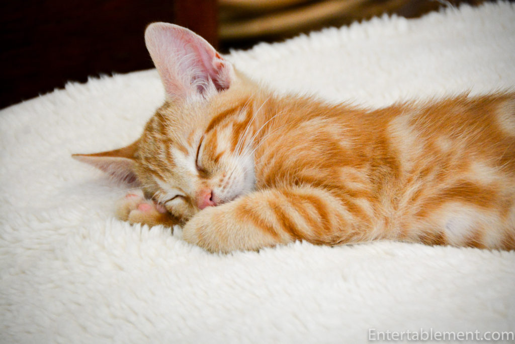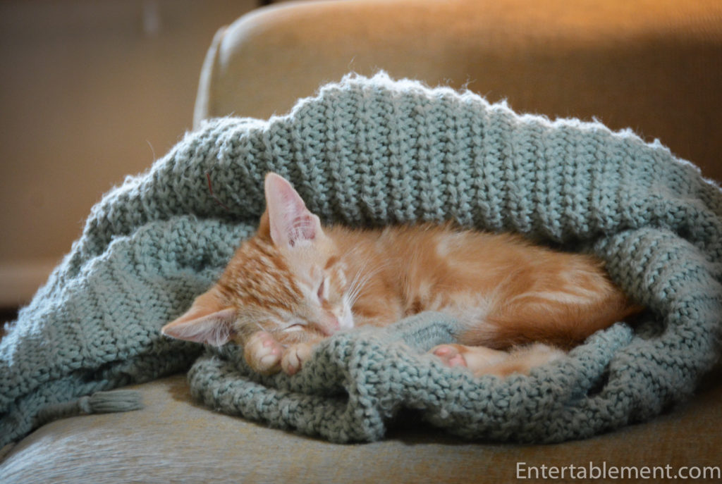 You know the household world order has changed when the 3 lb kitten plunks himself in the middle of the dog’s bed for a nap and the two golden retrievers have to gingerly arrange themselves into the surrounding space.