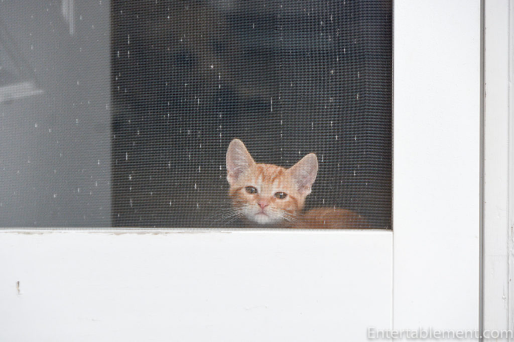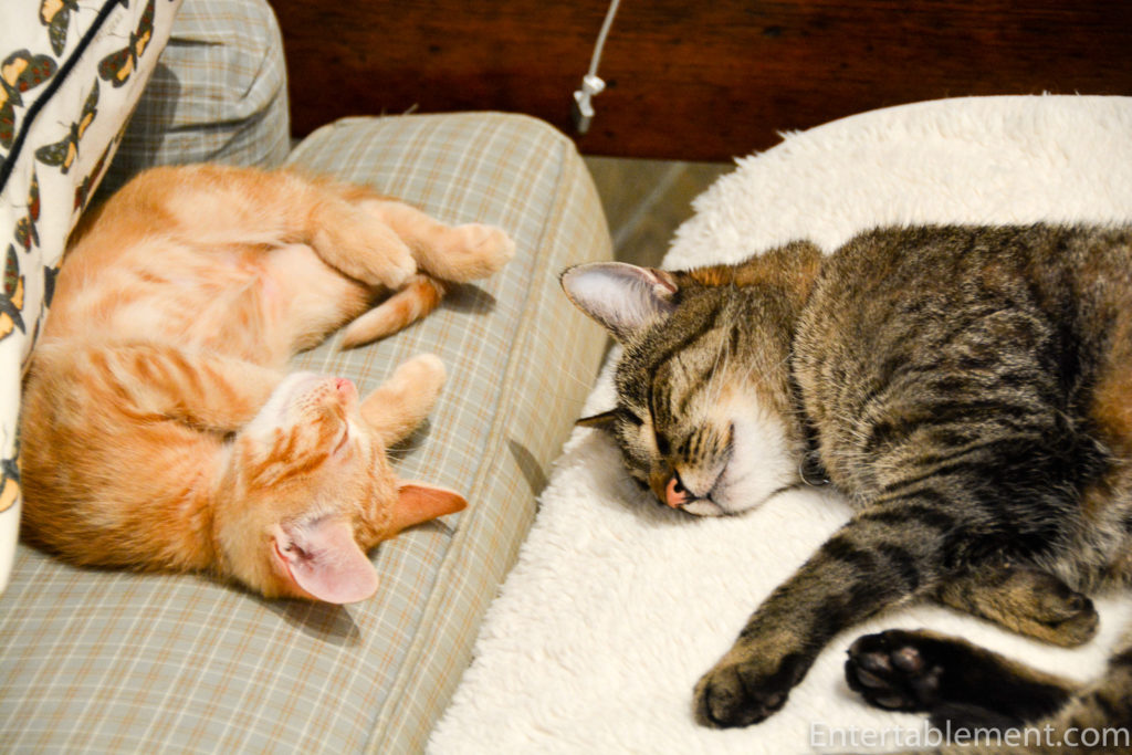 Even Moxie has finally accepted that he’s here to stay. She is still some way off from playing with him, however; she still snarls at him if he catches her unawares, but he is getting incredibly bold with her. He chases her mercilessly, darting out from under furniture and around corners, demanding that she acknowledge him. It earned him a good box on the ears the other day. He’s sporting quite a large bruise near his nose, likely the result of a sharp claw,