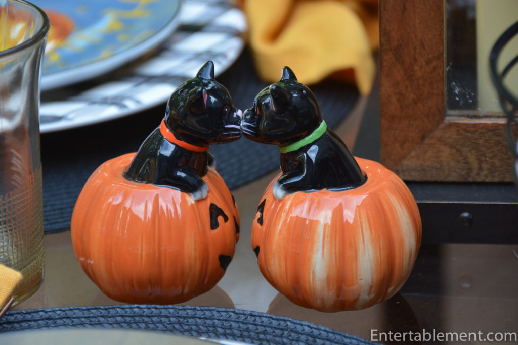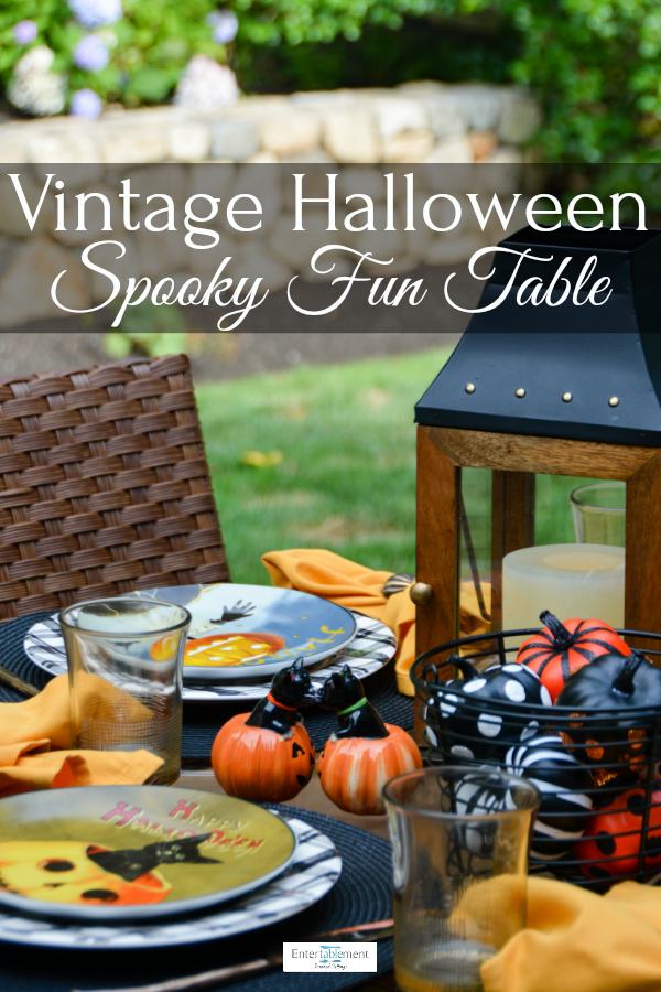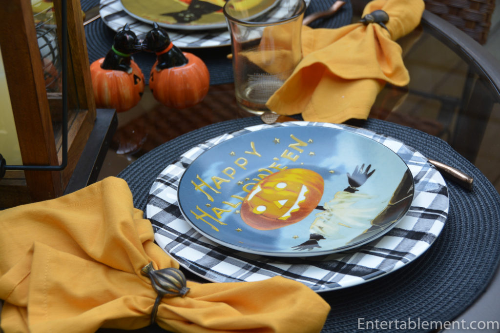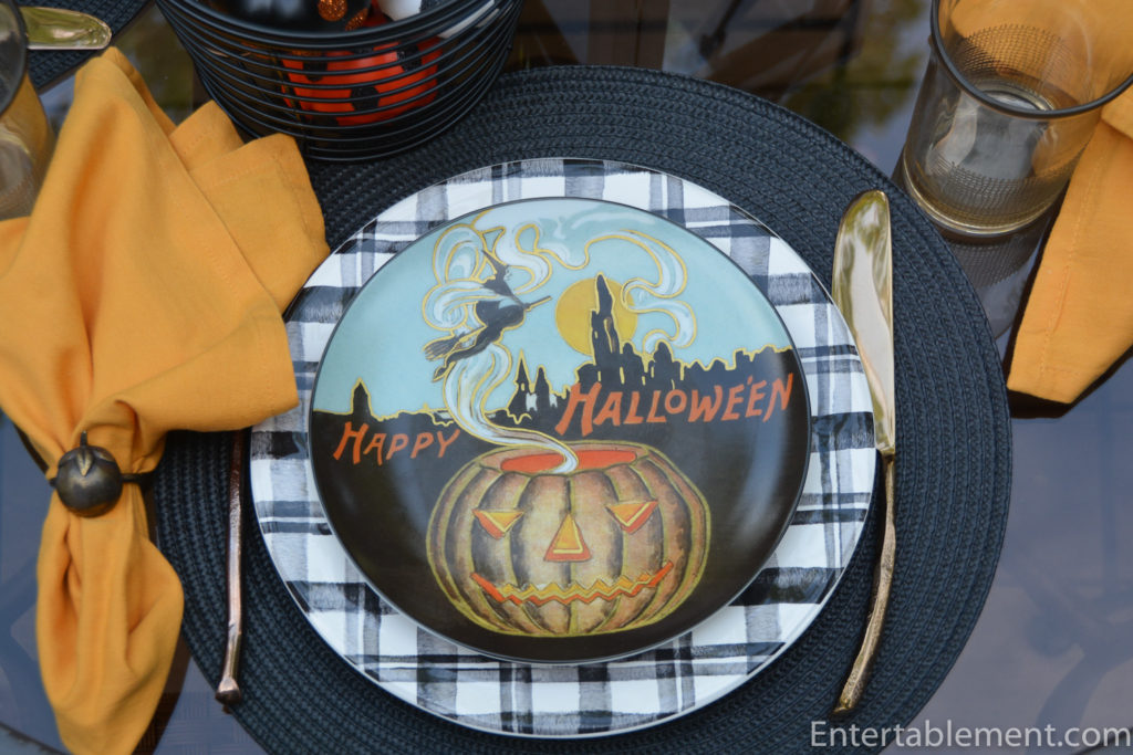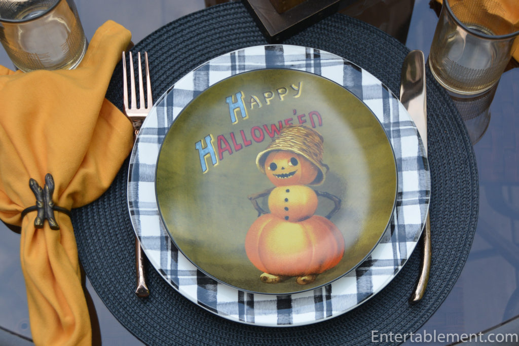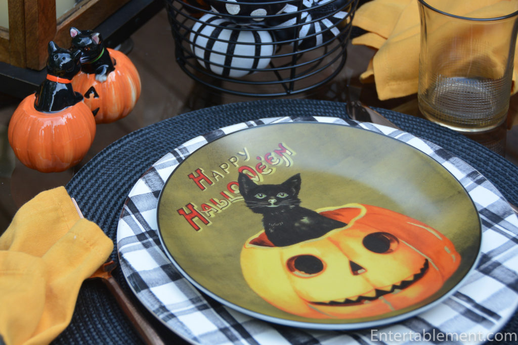 Pier 1 had some fun polka dotted pumpkins, and their black and white “Watercolour” black plaid plates formed a striking backdrop for the Vintage Halloween salad plates.