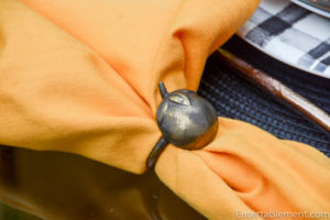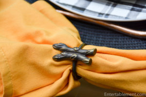 I used bronzey vegetable napkin rings (an eBay find) on deep gold napkins for a festively bright touch.
