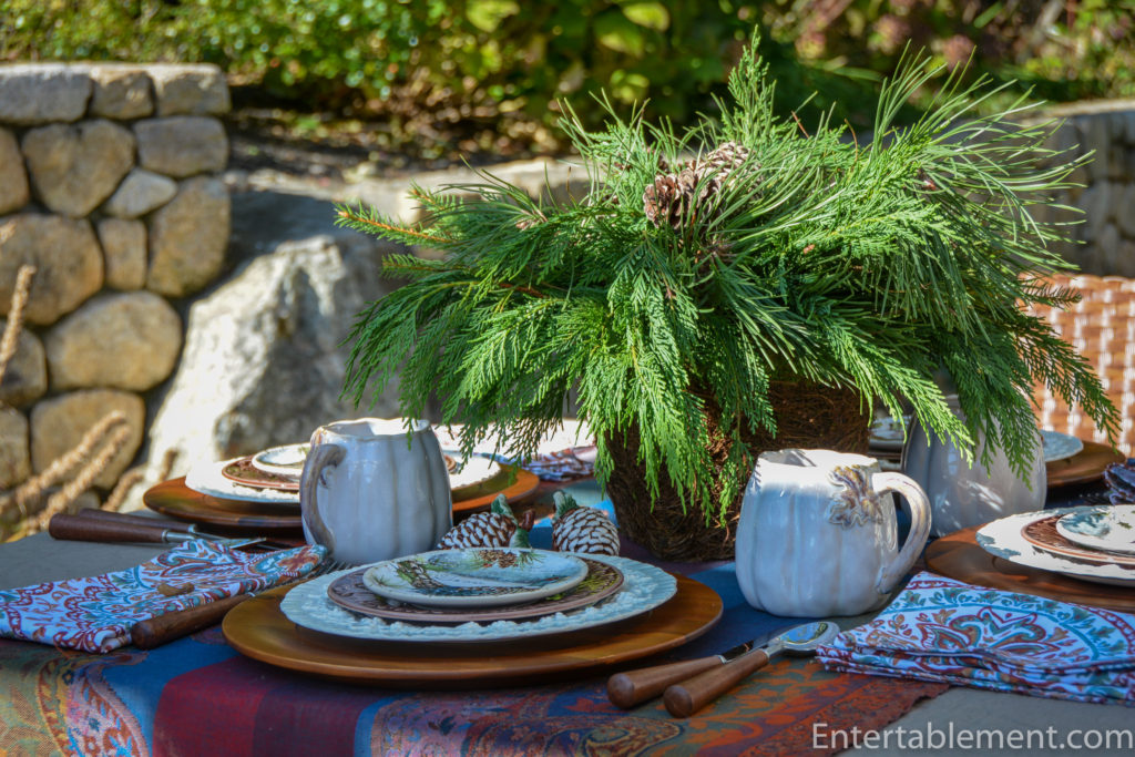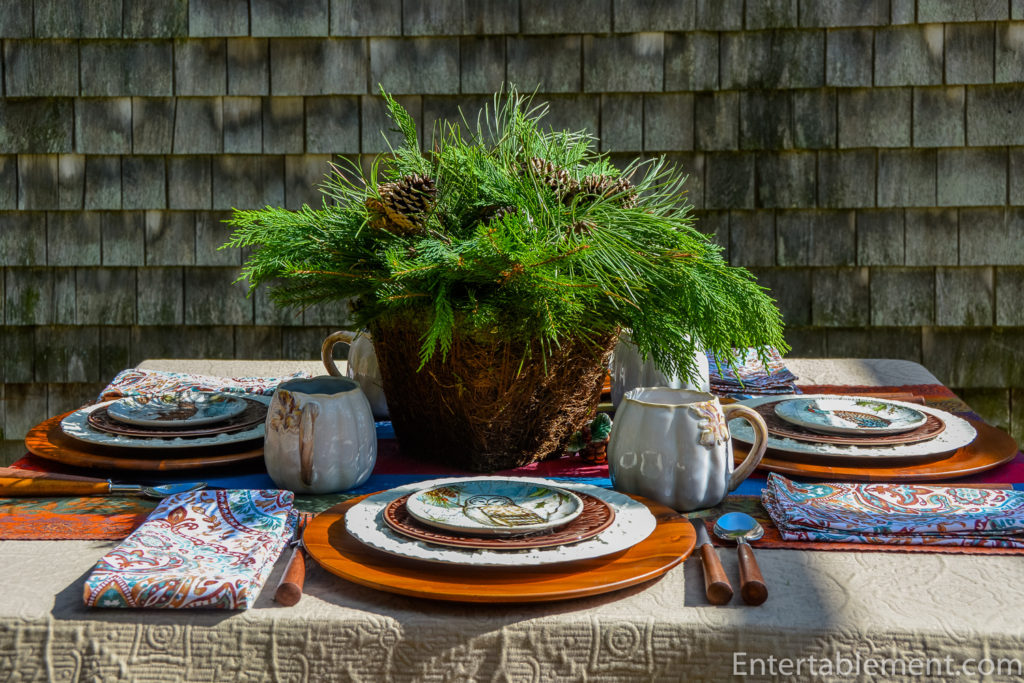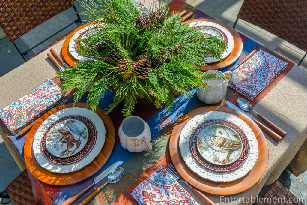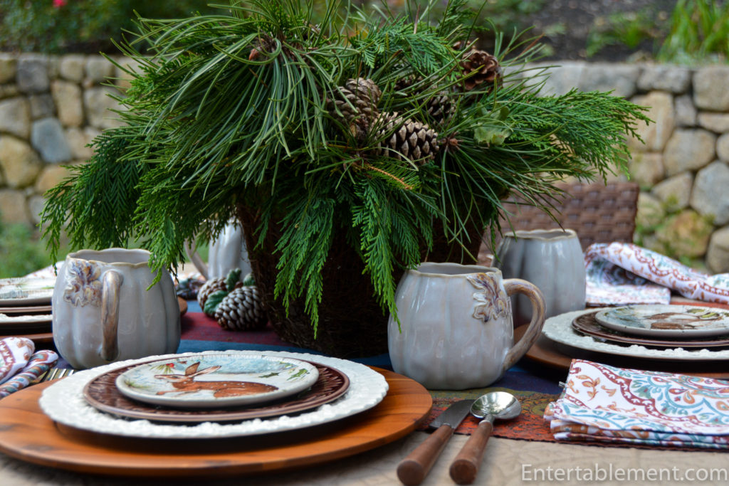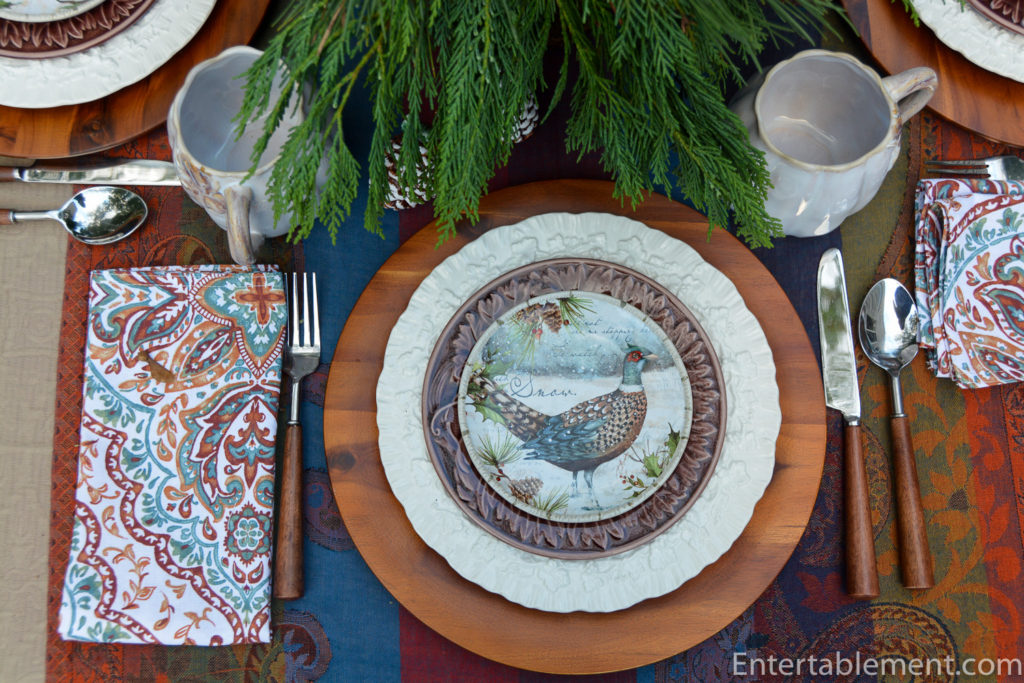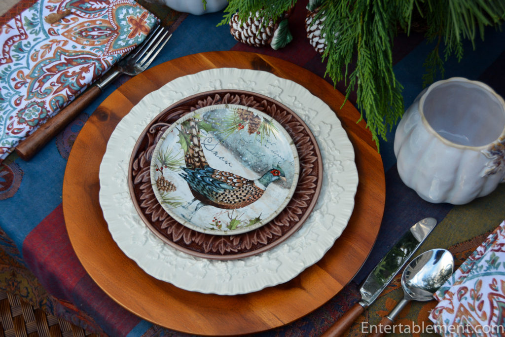Acacia Wood chargers, topped with vintage Cream on Cream shell-edged Wedgwood dinner plates, and brown oak-leaf Majolica salad plates layered up to frame the appetizer plates. The colourful pheasant takes in his pine-cone surroundings.