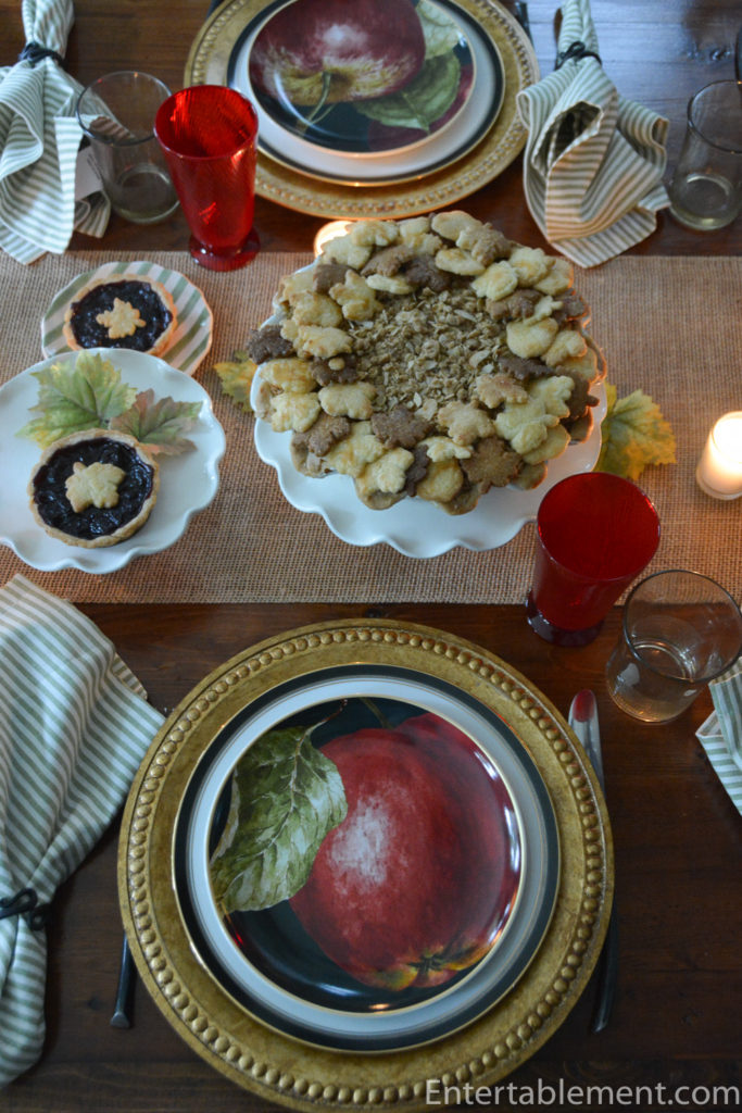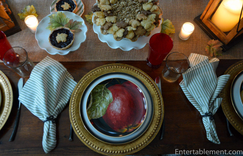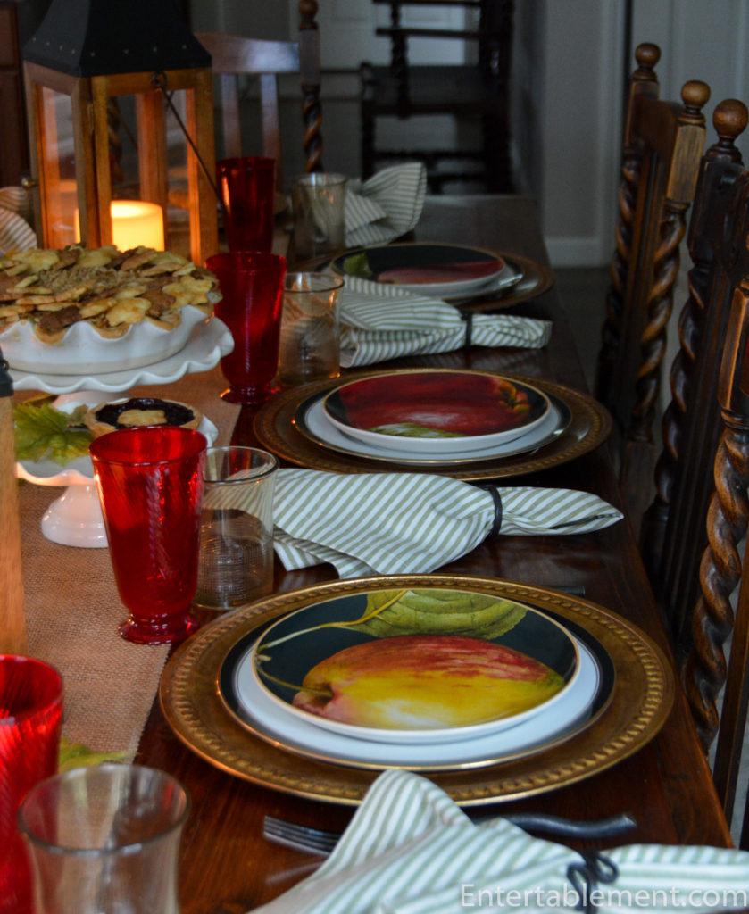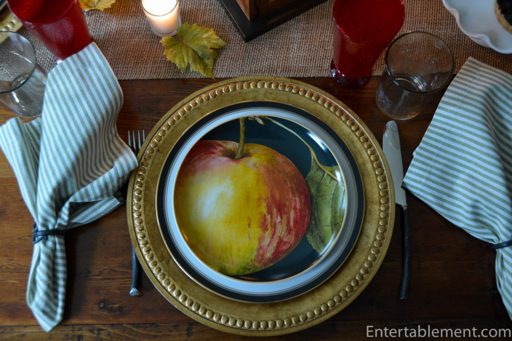 Taking the cue from the black background and gold rim on the apple plates, I set a base with gilded chargers and black-rimmed rimmed dinner plates, Nocturne by Royal Prestige. Both the salad plates and dinner plates were eBay finds. The chargers came from Pottery Barn aeons ago.