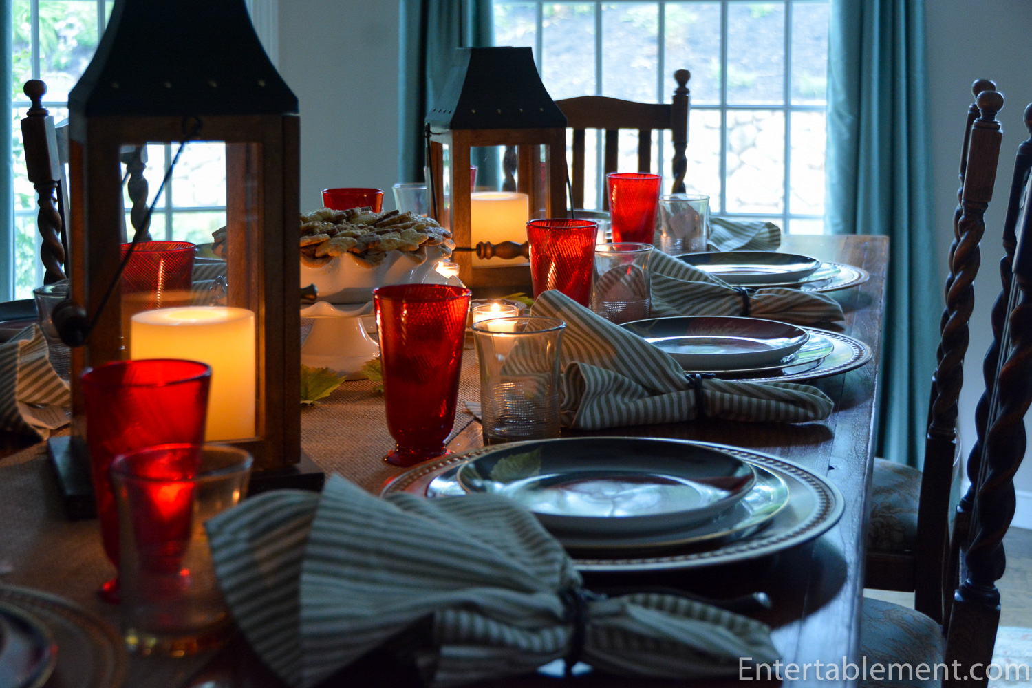 I too succumbed the Arabella sale at Juliska, purchasing the highballs, double-old fashioned, and wine glasses. The color and the swirling pattern (similar to your amber glasses that I admire so much) were too much to resist at the sale price. After receiving them I became worried because it really is a very strong red and I realized I had nothing except plain white dishes to use with them unless I wanted to go red, white and blue. The above table reveals how beautiful they can be on an autumnal table. I’m realizing how little imagination I have and look often to you for inspiration and encouragement. I’ll soon be looking at more than Christmas dishes on eBay and Replacements thanks to you.