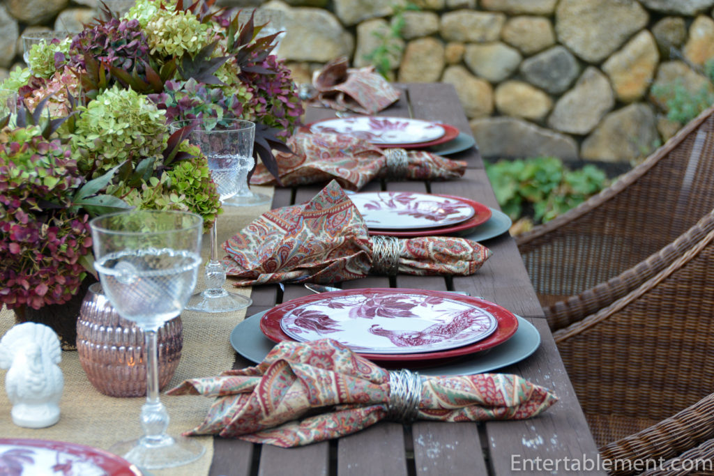 And Norwood paisley napkins from Pottery Barn added some warm earth tones to coordinate with the bark-covered vases and the burlap runner.