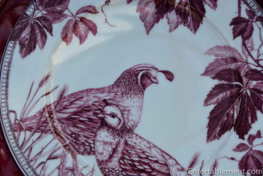 “Opulent yet understated, these porcelain salad plates are embellished with lush vines and wild birds in a striking monochromatic palette. Inspired by vintage English transferware, our original illustrations add bold sophistication to the autumn table.”  That certainly sums it up.  Better yet, it comes in three colours. This elegant grey…