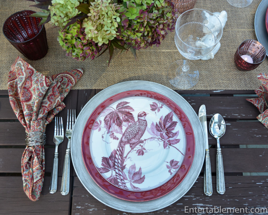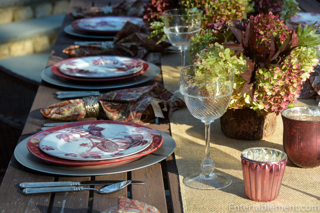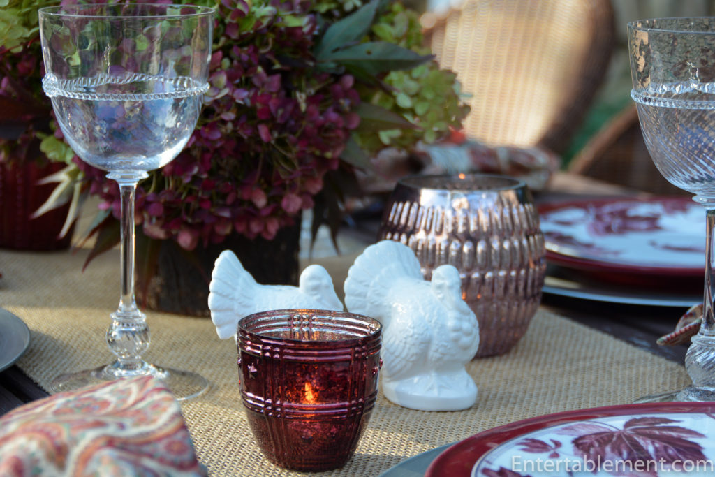 Pottery Barn had some marvellous mercury glass votives in a variety of sizes, and the colour coordinated really well with the plates and the deep burgundy of the hydrangea. As an aside, both Williams Sonoma and Pottery Barn are having a 20% off everything sale right now if anyone is tempted to augment their fall tableware.