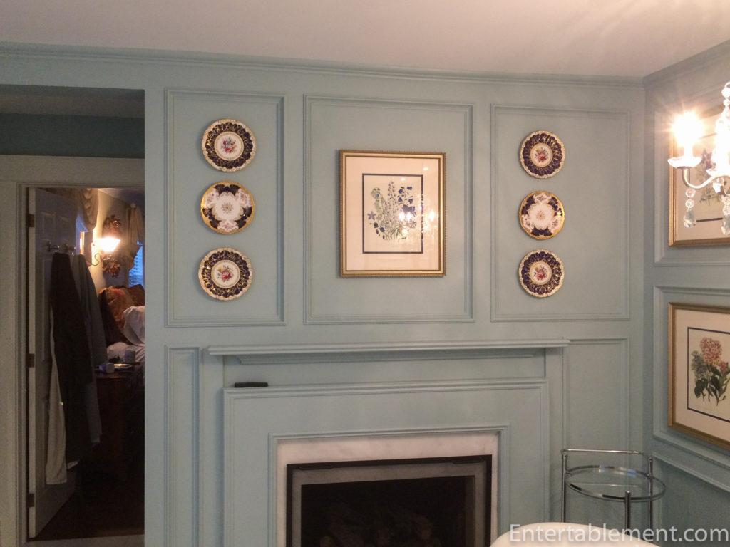 The solitary picture over the fireplace looked kind of lonely, so I added in some plates. I think they do the trick nicely. Thoughts, anyone? Note the bar cart in the corner, just waiting for a champagne bucket and a couple of glasses. As soon as the blinds are installed, I’m having my first bubble bath to celebrate!