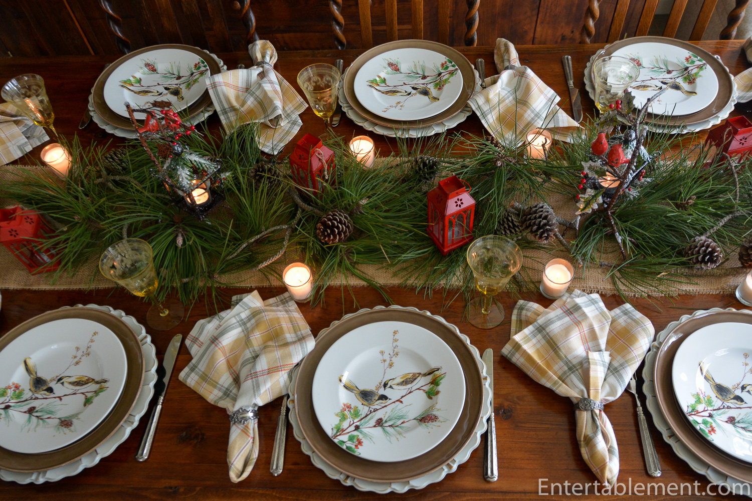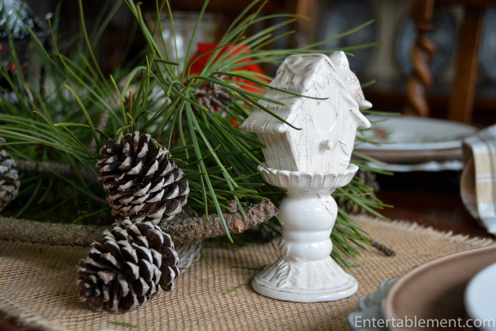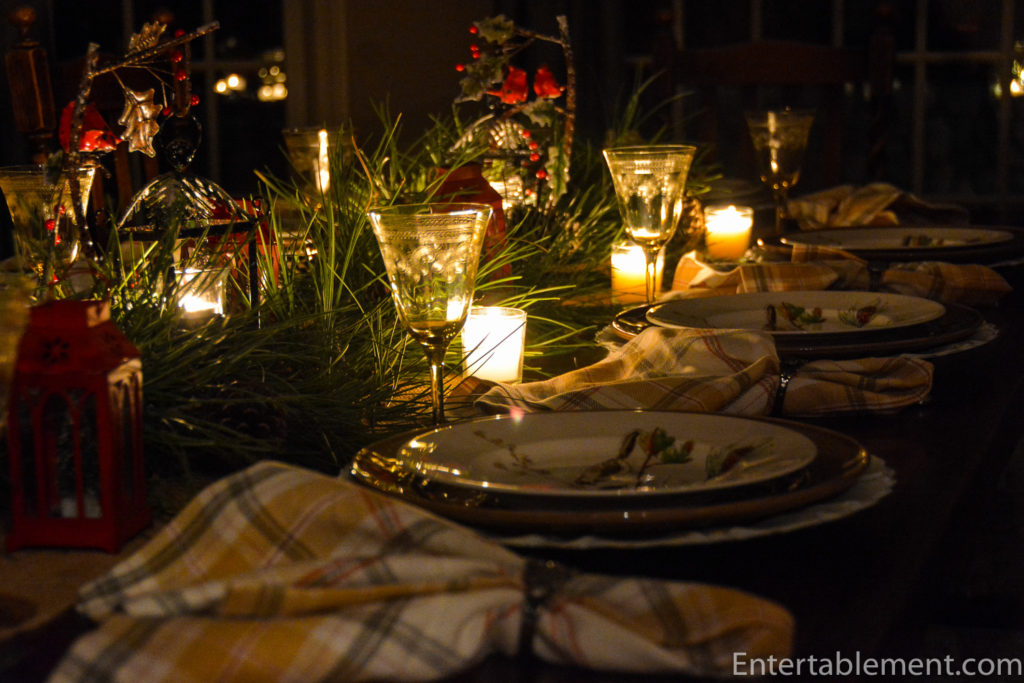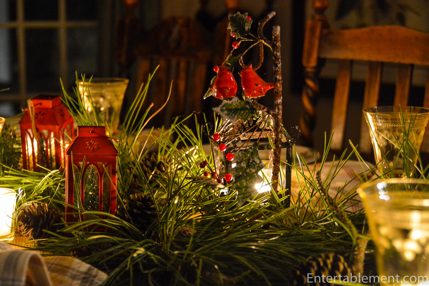 I had to get on a step ladder this year to reach them, right up on the “do not climb on this step” step, clippers in hand. Not smart, but I did not come to any grief (thank goodness). I brought down one good-sized branch and it furnished all the greenery that was needed for this table. Good thing – I wasn’t going to make another hare-brained attempt.