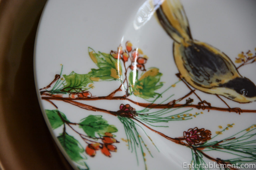 Lenox’s Winter Song was made for this time of year. The sparse palette echoes the muted colours in our Northern landscape. Described thusly: “Winter Song combines rich bands of red with beautiful winter imagery and sprigs of holly and branches of pine. Nestled in these are colourful nuthatches and chickadees, all executed in a painterly pattern.”