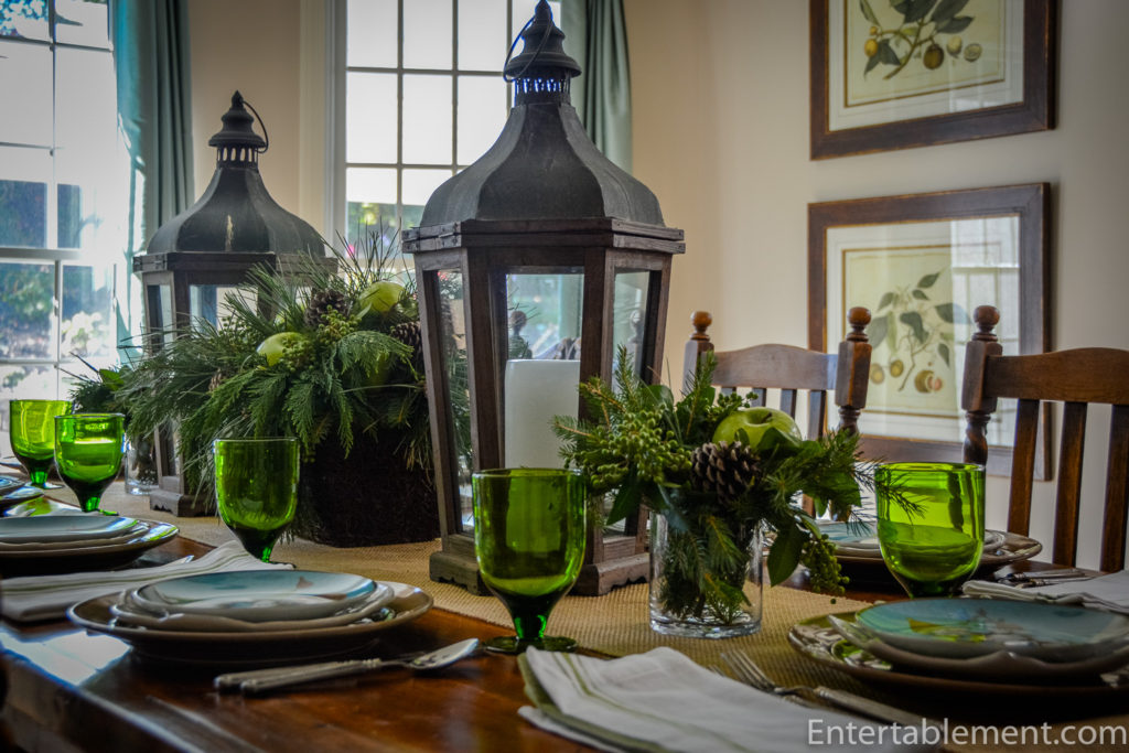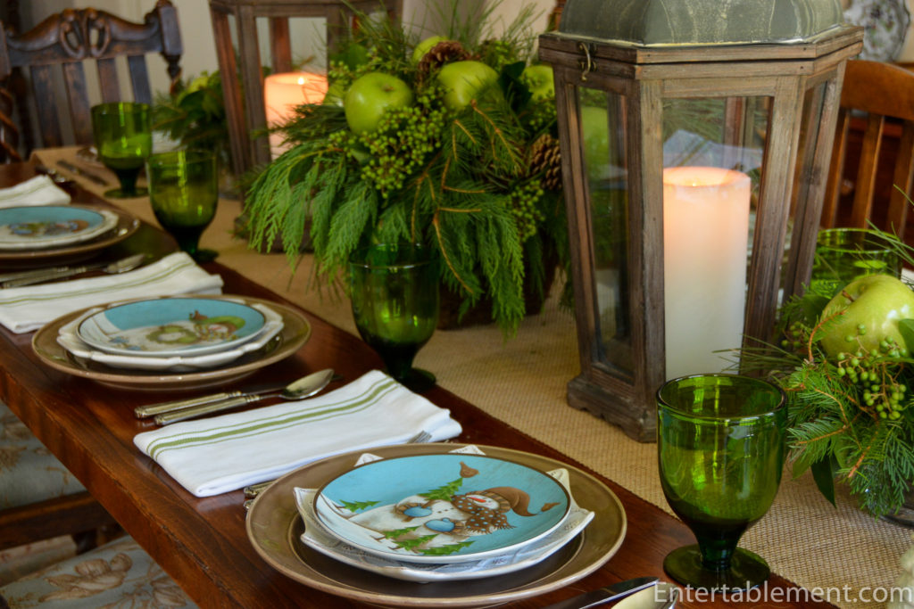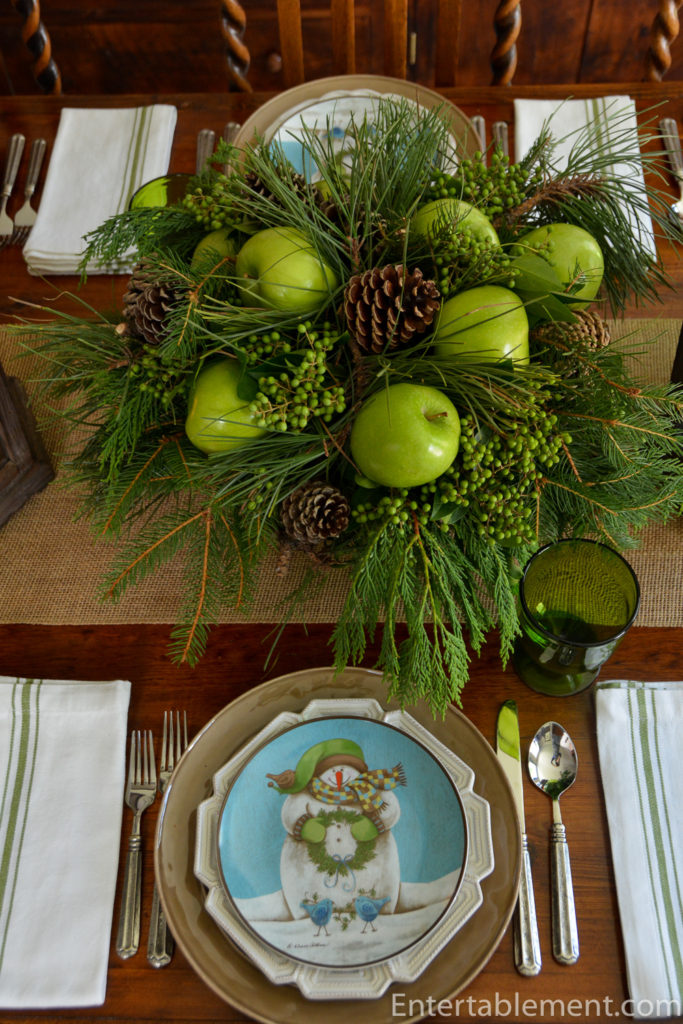 The green apples did the trick, though. I had set another table using the greenery with pine cones when it occurred to me that I could augment them with the green berries (an obliging local shrub) and the ubiquitous Granny Smith.