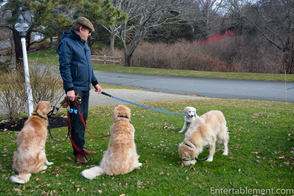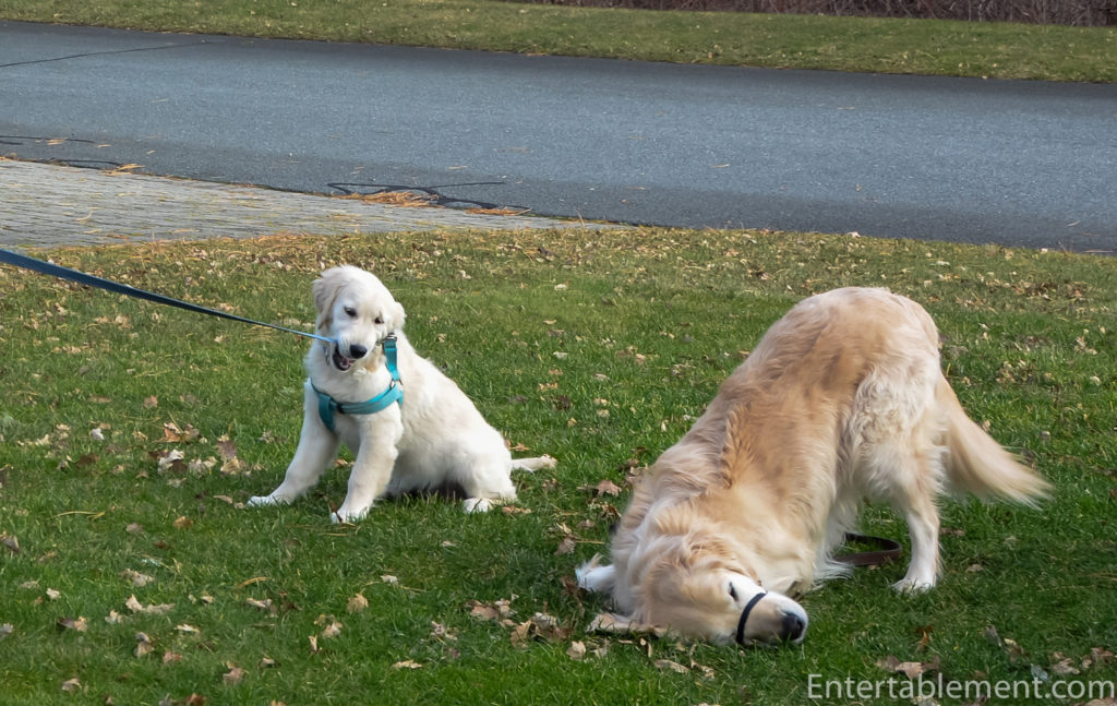 Clementine had her final shots a few weeks ago and at last was able to join the rest of the dogs on their daily walk. Ok, I’ve got my harness on. Churchill! I have your haltie for you!