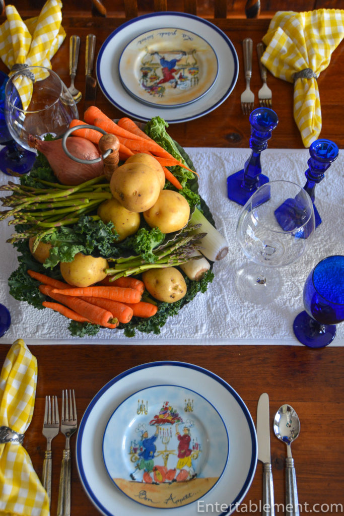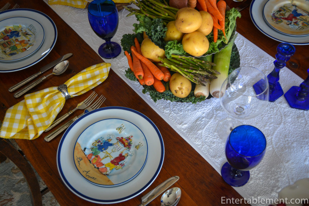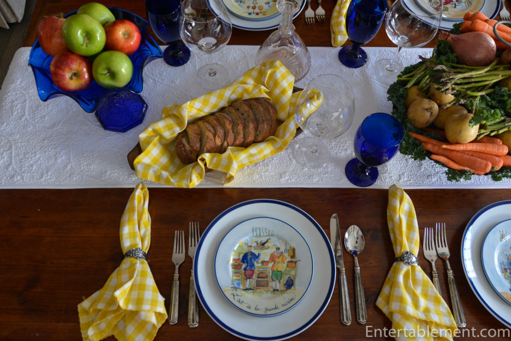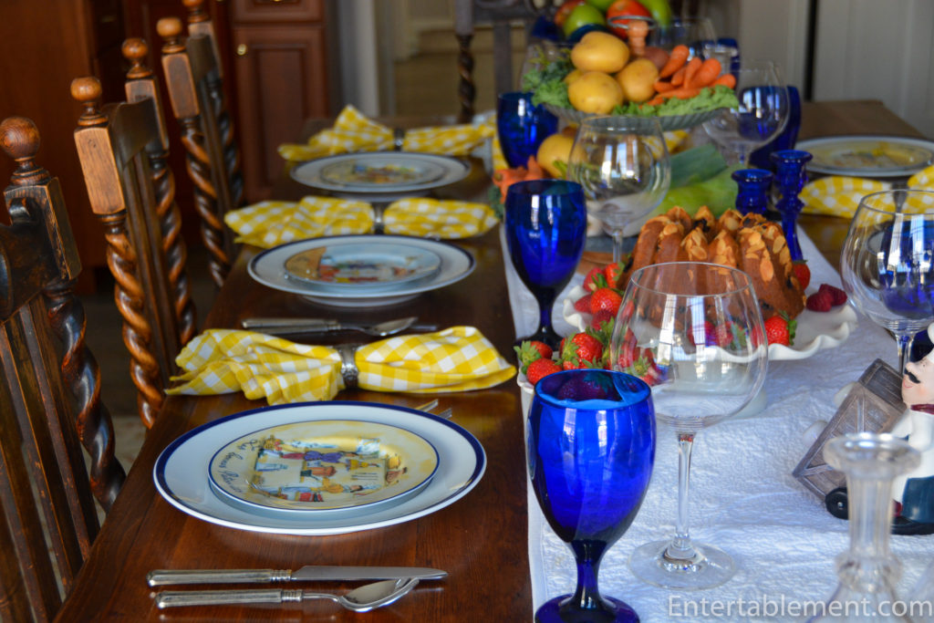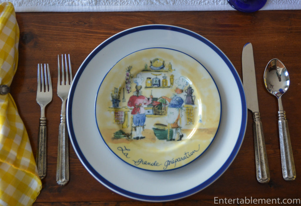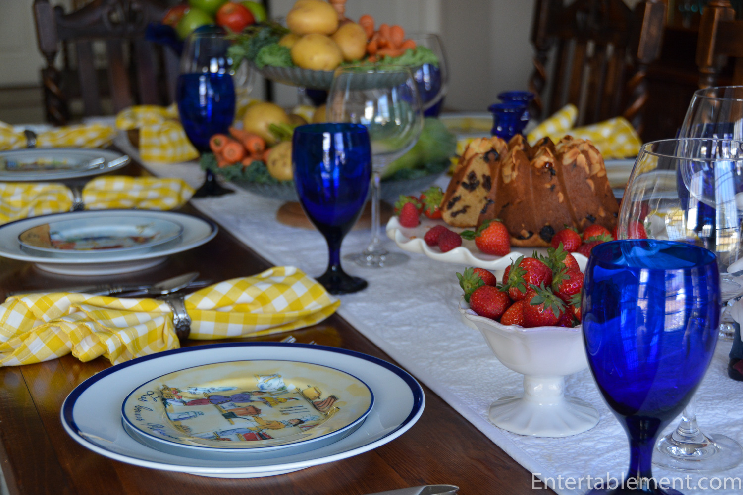 Such picturesque plates that you seem to always find. They’re adorable. The Cobalt blue is striking and those candlesticks are brilliant but I really love your chef that is holding the salt and pepper shakers. Nothing like eating your centerpiece!!