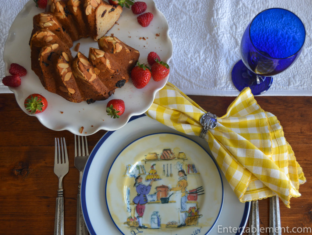 I couldn’t help but be inspired by these cheeky plates, and set about making a Kugelhopf, one of the celebration breads in which I delight. This one is leans more towards cake than bread, although one uses yeast in the preparation. Muffins strike me as more cake than bread – a similar distinction.