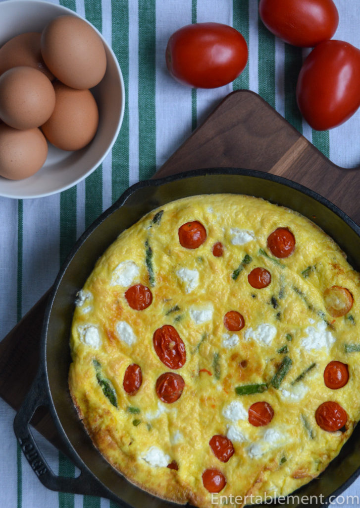 3. In a 10″ cast iron skillet, melt the butter over medium heat. Add the asparagus and tomatoes and sauté until warmed through and the tomatoes are beginning to soften (about 2 minutes). Pour the egg mixture gently over the vegetables. Sprinkle the remaining goat cheese over the egg mixture. Allow to cook until set (about 4 minutes).