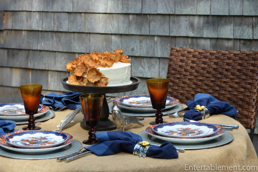 What to pair with it so the pattern was enhanced and the table was not overwhelmed? A Pumpkin Cake embellished with pineapple flowers, of course! I loved the way the flowers imitated the form of the chrysanthemums on the Fleur plates.