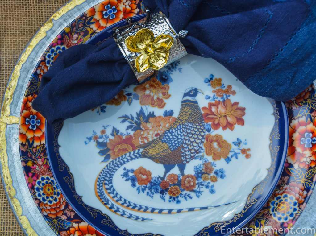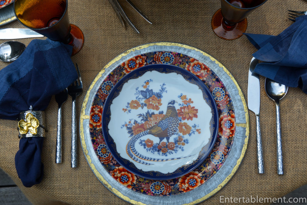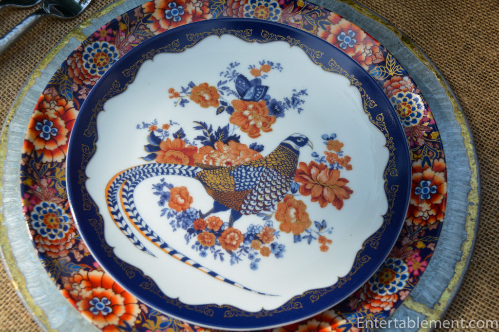Hope it’s getting easier with the dogs. You must be one of those people who find solace in creativity. Why else have your two last tables shone so? I see only blue, orange, and gold, and you pull out the amber of the pheasant’s back feathers. Sigh. I would have used the Arte Italica Medici to echo the rim and napkin ring, and I would have been wrong…