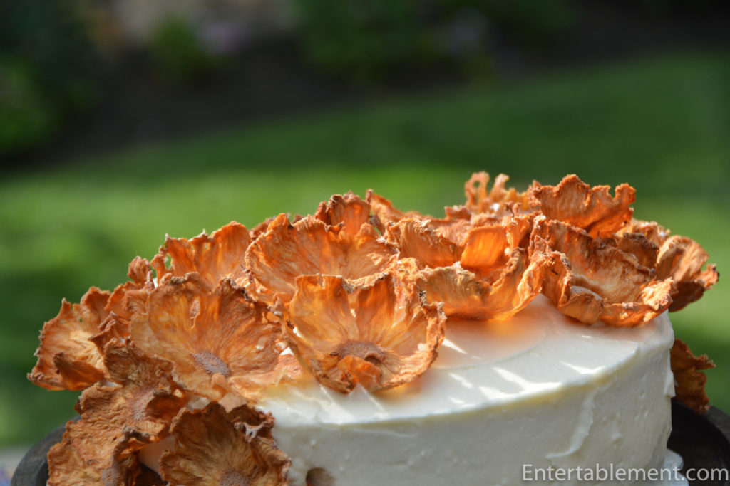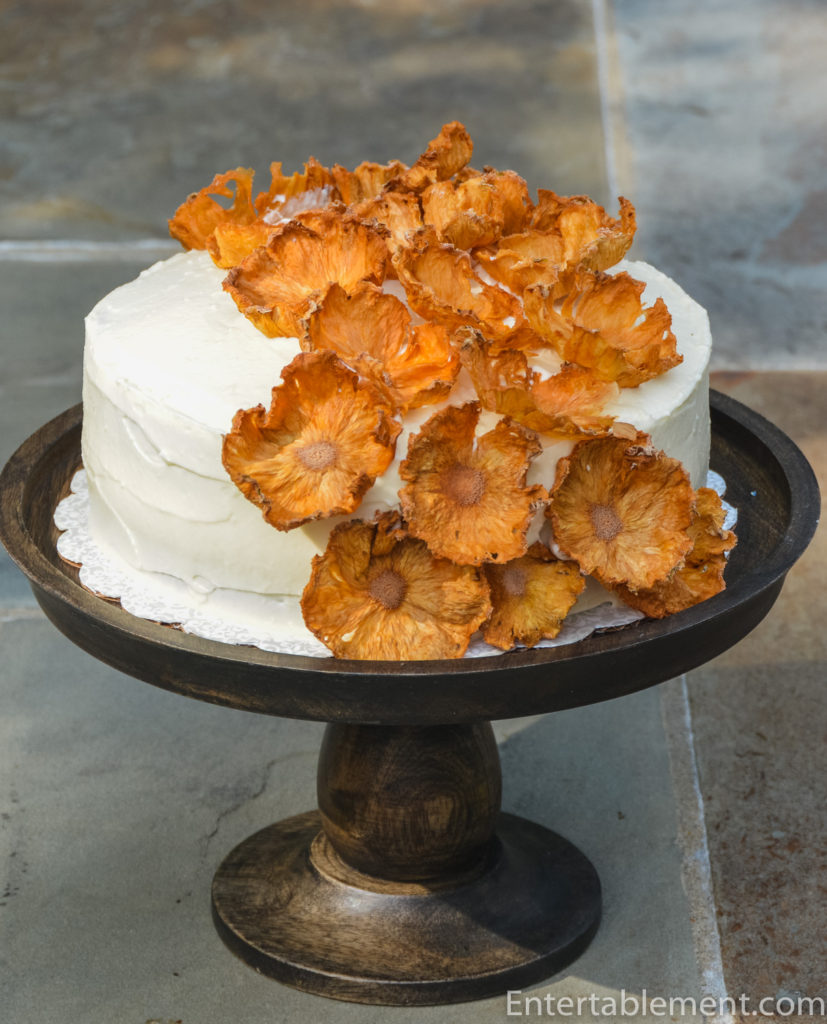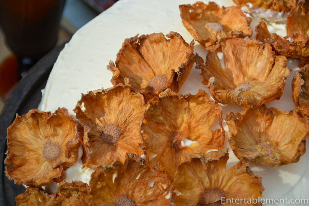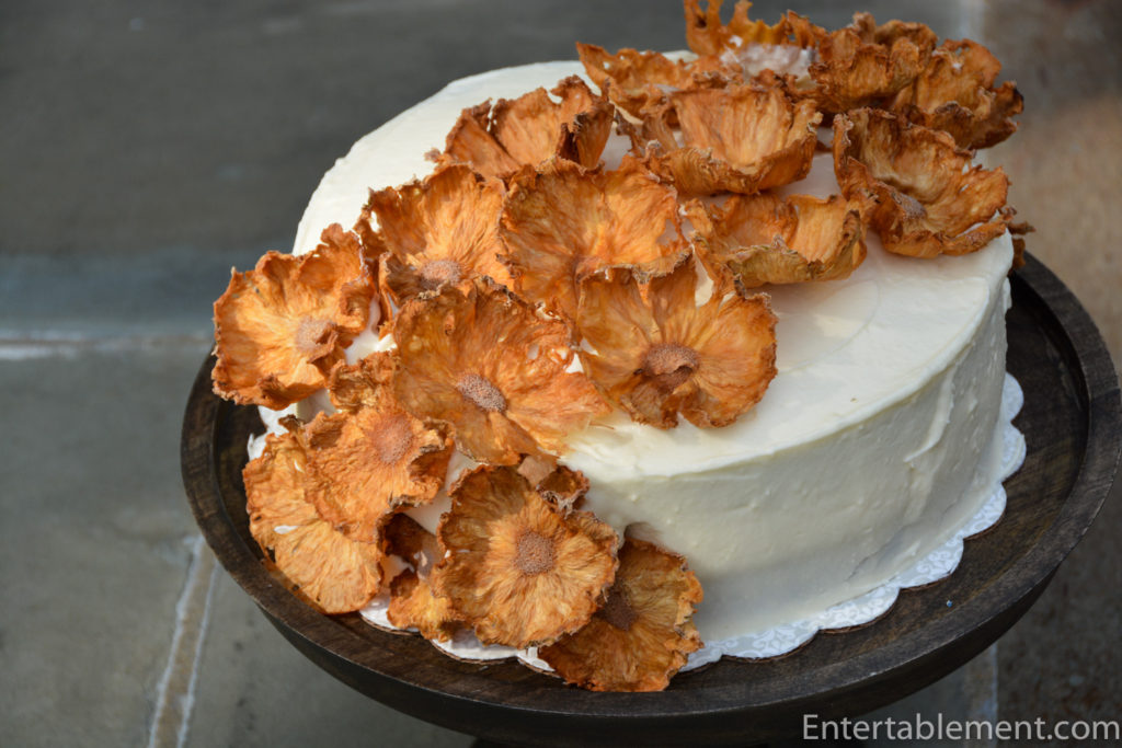 - I made the pineapple flowers and the cake layers well in advance and froze them. That way I was only dealing with icing and decorating the cake on the day I wished to serve it.
