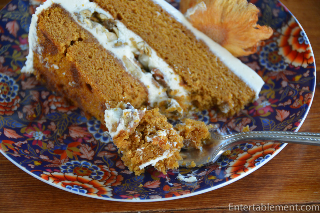 This latest version was an even bigger hit. I piped a thick layer of cream cheese icing between the layers of the cake, topping it with a generous portion of a candied ginger, pecan and pumpkin seed filling.