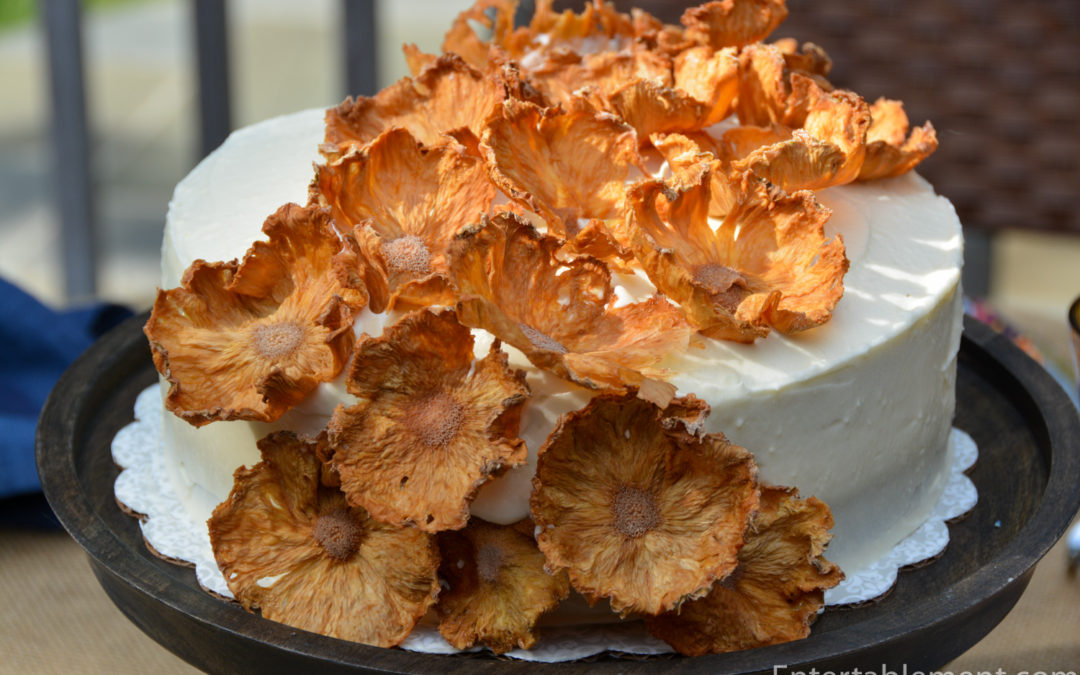 - I made the pineapple flowers and the cake layers well in advance and froze them. That way I was only dealing with icing and decorating the cake on the day I wished to serve it.