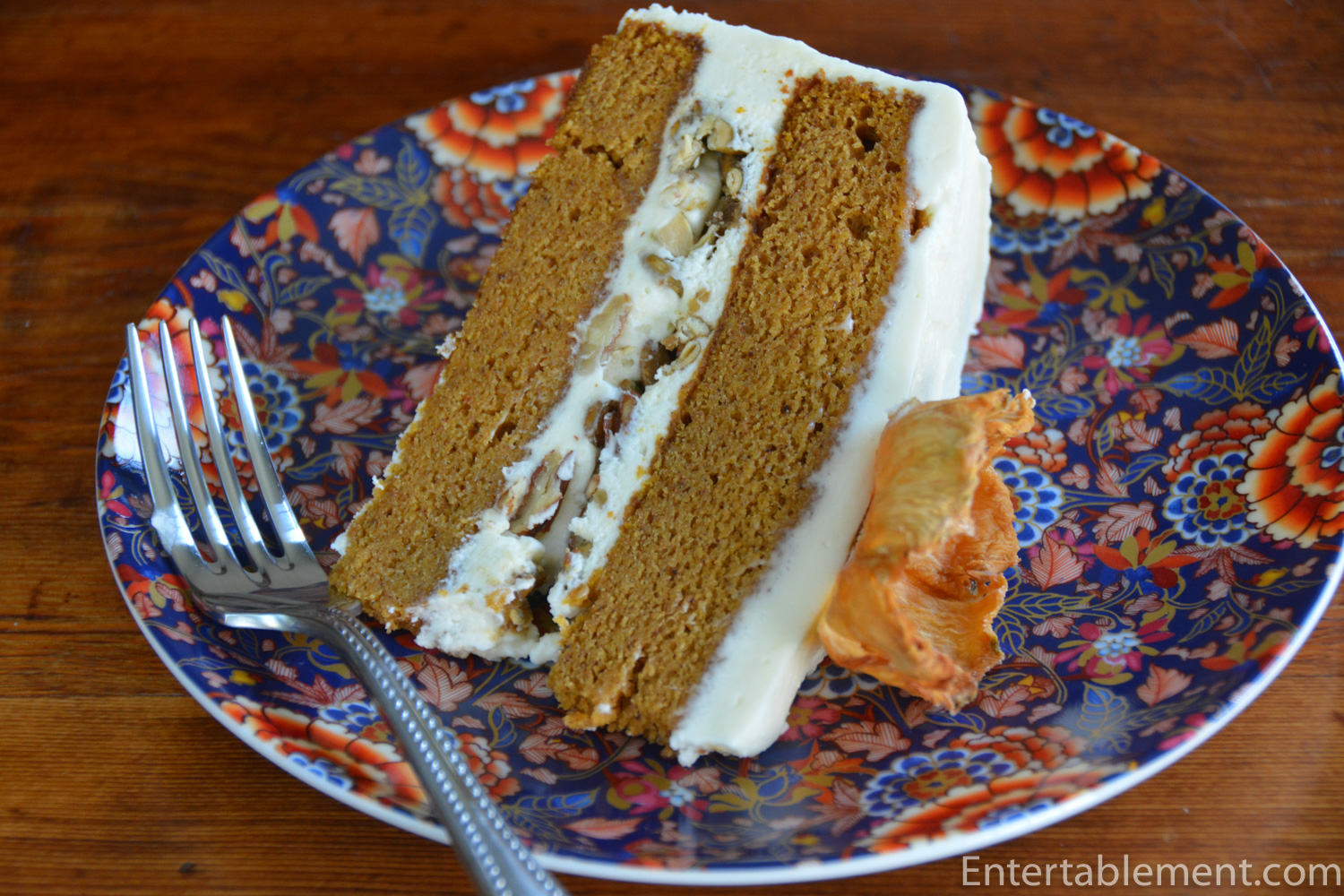 This latest version was an even bigger hit. I piped a thick layer of cream cheese icing between the layers of the cake, topping it with a generous portion of a candied ginger, pecan and pumpkin seed filling.
