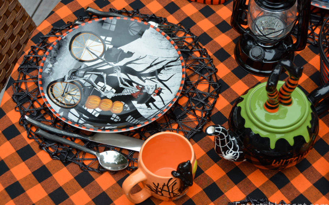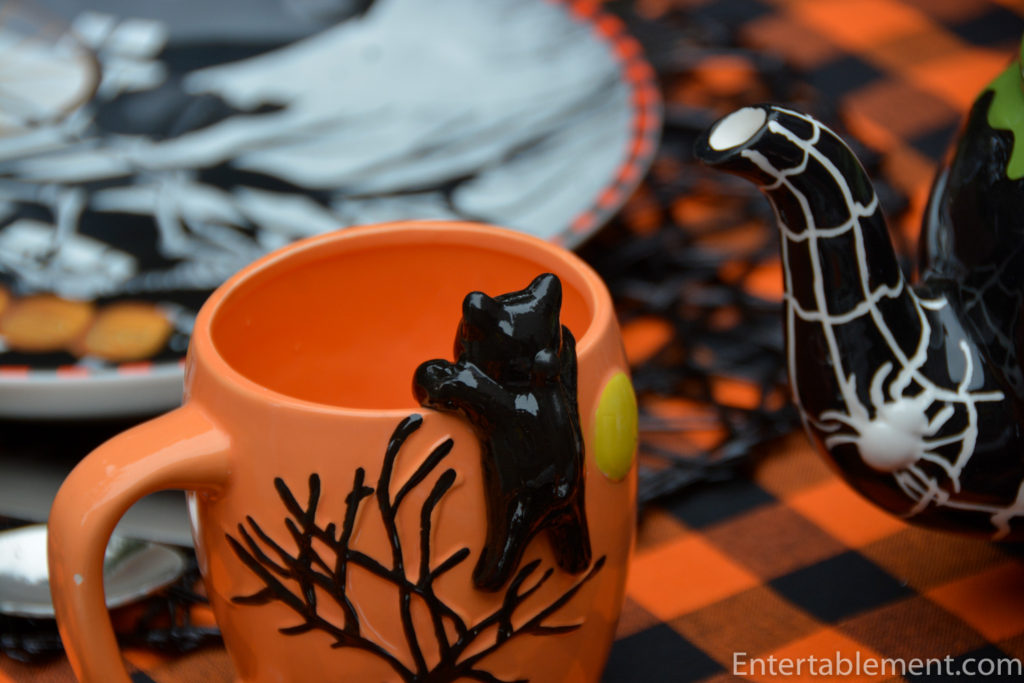 The orange and black colour scheme really does capture the essence of October and Halloween. Ordinarily I am not a lover of anything with skeletons on them but these plates are ones that I would be quite pleased to have in the cupboard. The mugs add a cute charm which fits the scheme well…lovely table design!