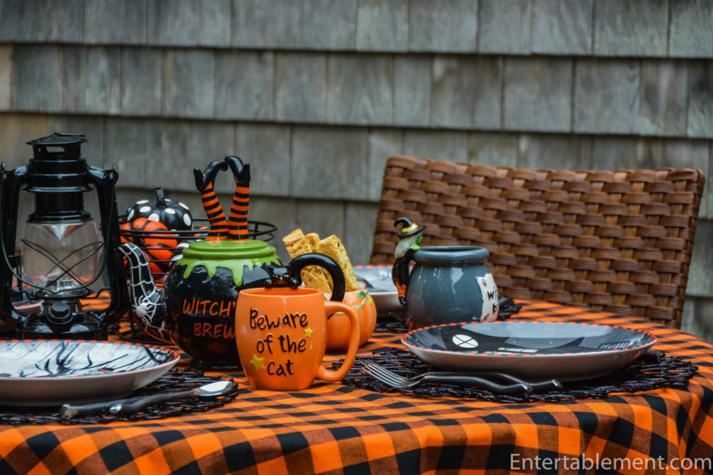 Pier 1 provided the Witch’s Brew teapot. Â Love the flailing legs clad in striped stockings.