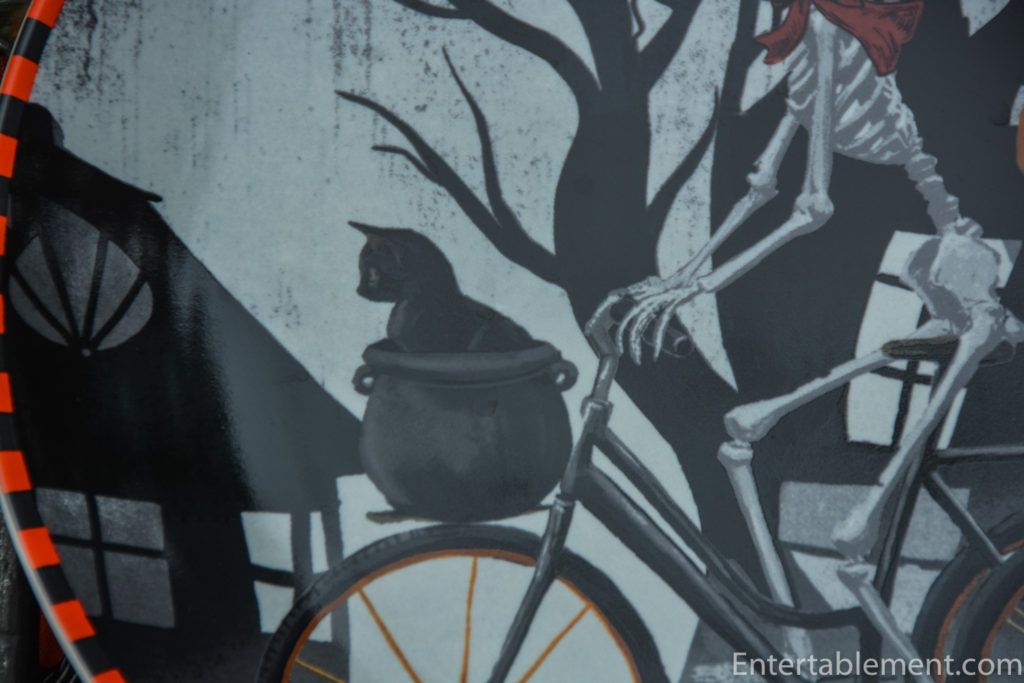 The BOO letters on the pumpkins look like they’ve been carved into the pumpkins, and the wheels of the bicycle are picked out in orange. The orange and black pattern around the rim of the plate is more attention to detail. Good job, 222 Fifth.