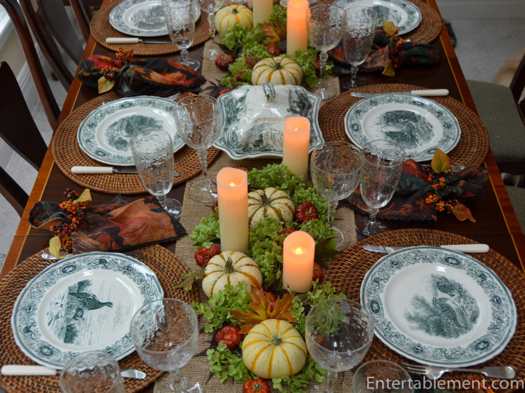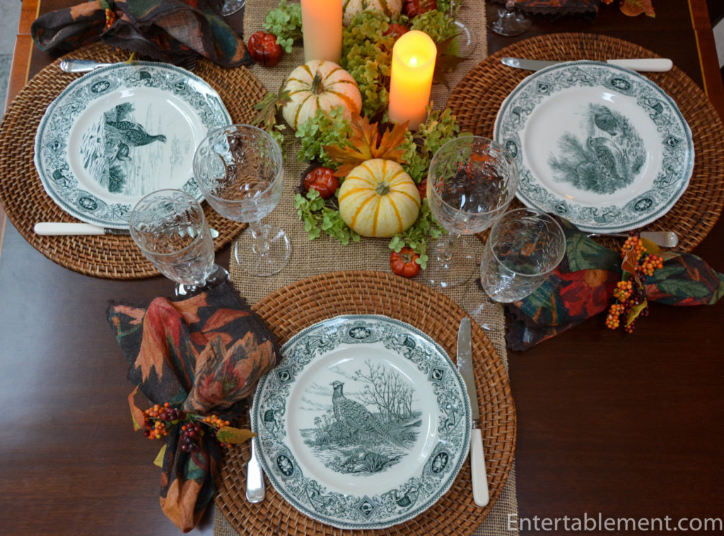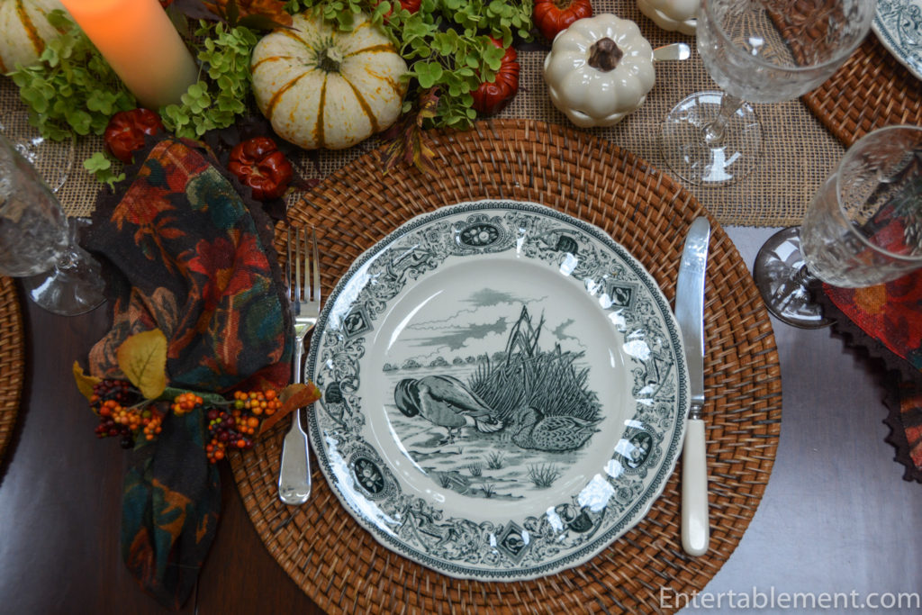 Such an apropos setting for this time of year – ducks, pheasants, quails, etc in all their glory being displayed by the master table setter. The covered vegetable bowl is so beautiful and almost too pretty to use. You’ve blended everything beautifully together once again. Well done!