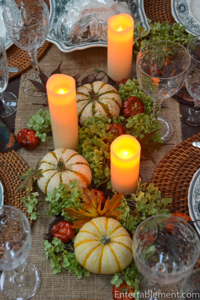 The centrepiece was easy. Plonk down the very forgiving burlap runner from Save on Crafts. Start with pumpkins from the grocery and a set of flameless candles in varying sizes from Amazon (complete with remote control – I feel like Dumbledore when plying the remote). Fill the remaining space with snips of Annabelle Hydrangea from the garden, a few silk leaves and small dried pumpkins (a vase filler from Pottery Barn several years ago).