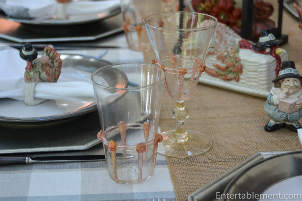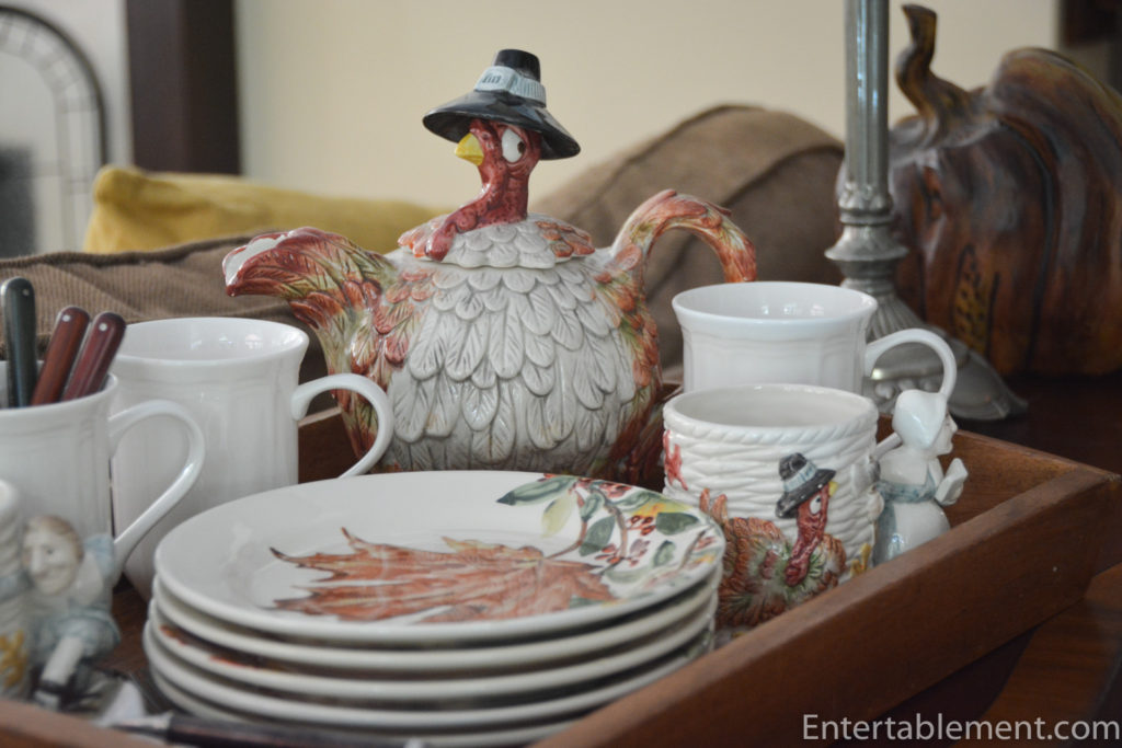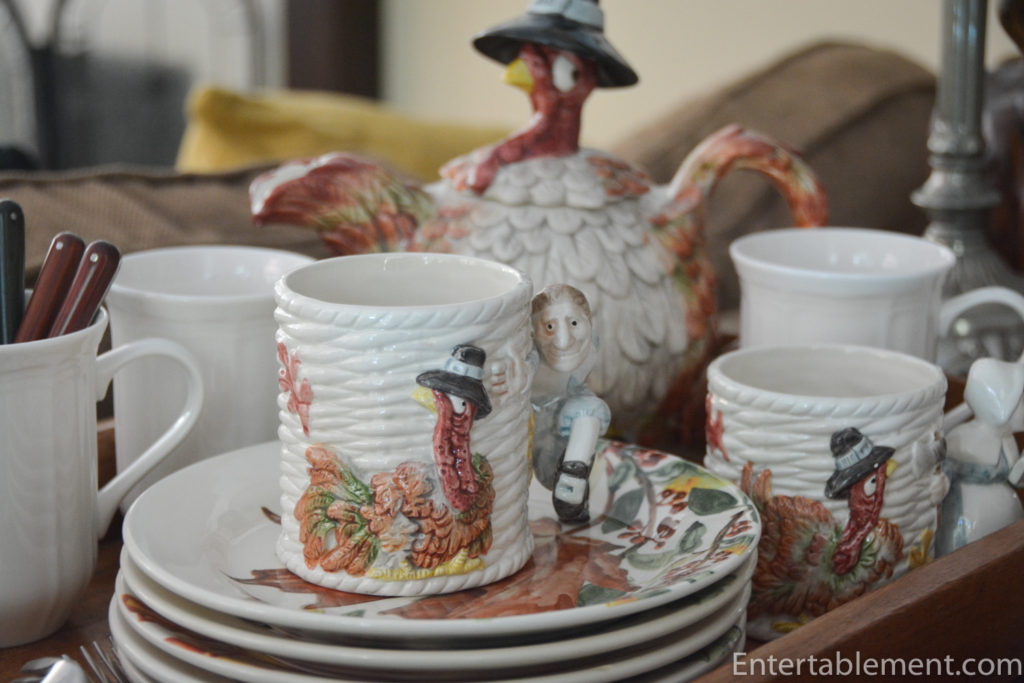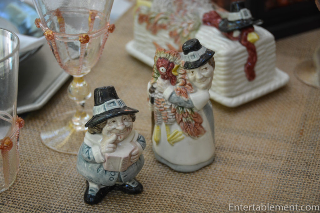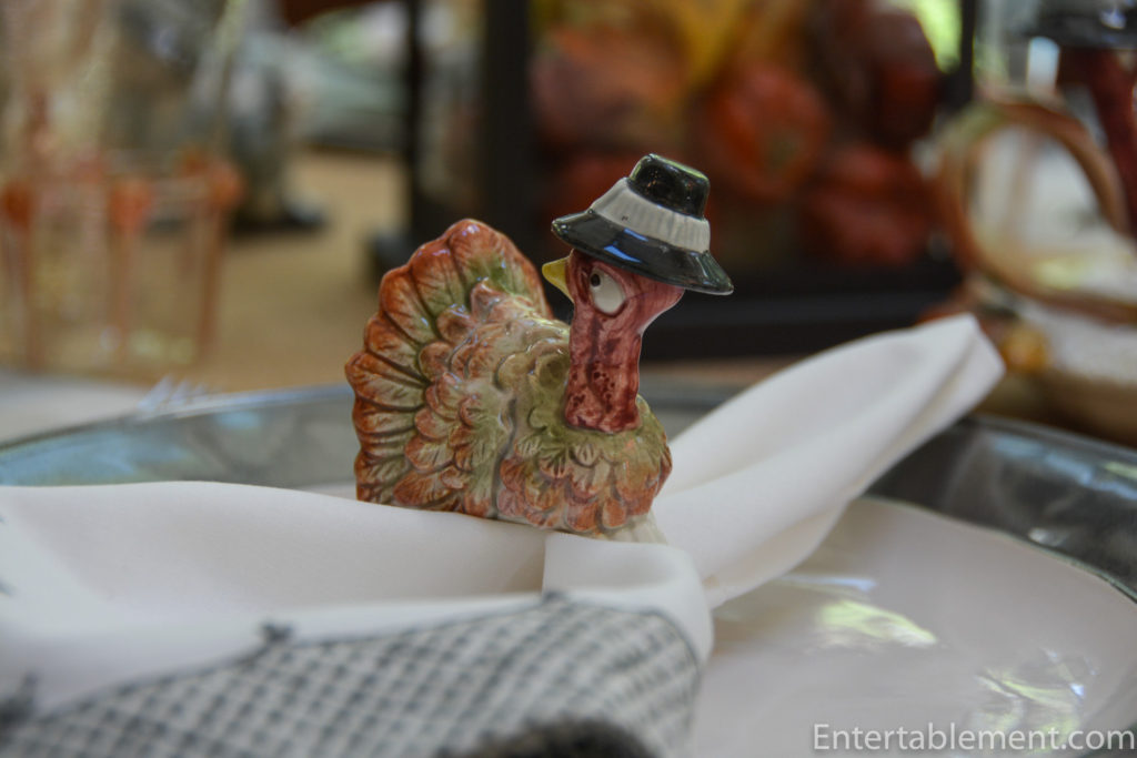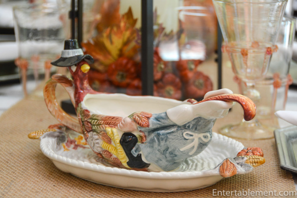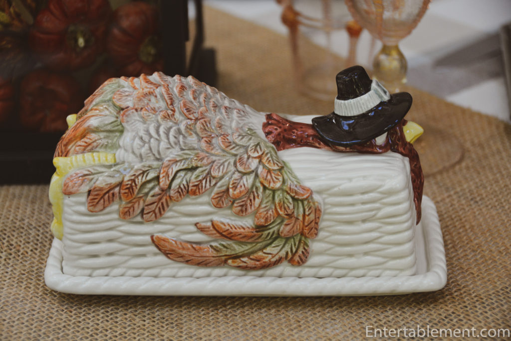 This year’s theme revolved around a vintage Fitz & Floyd set of serving ware from the 1980s called Pilgrim’s Progress. It’s a funny set, bound to appeal to youngsters and the young at heart. I discovered it on eBay when looking for some Thanksgiving-themed napkin rings. There were four of this adorable turkey on offer and I snapped them up, not realizing there was an entire set of coordinating pieces.
