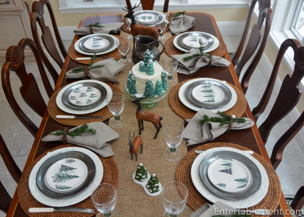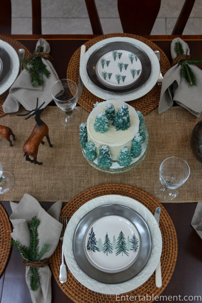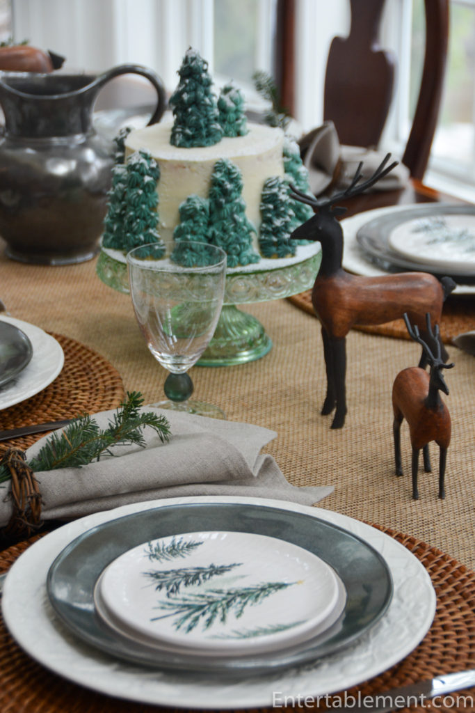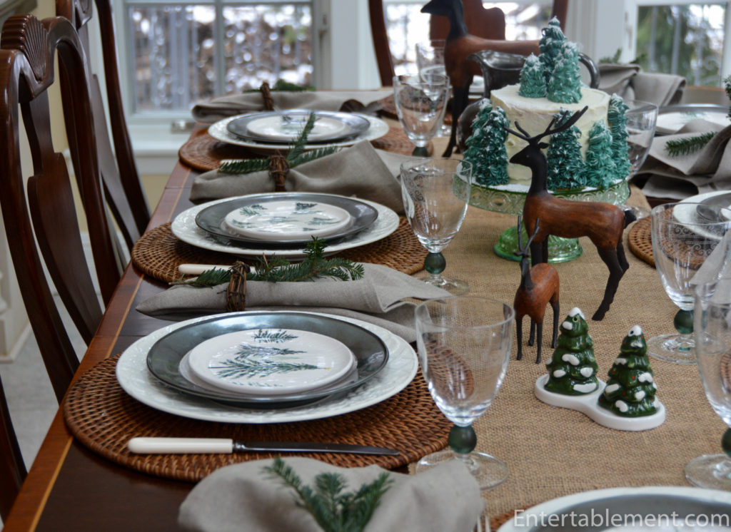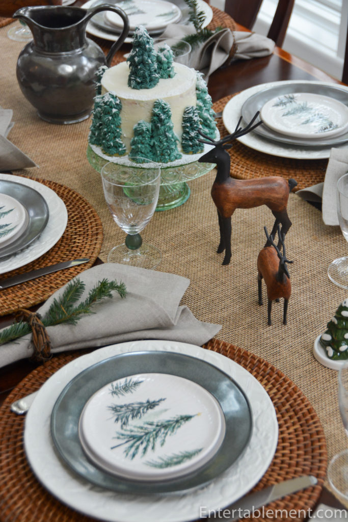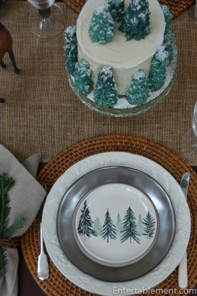 The tree appetizer plates are sitting atop Emerson Pewter Salad plates from Juliska and English Countryside dinner plates from Mikasa.