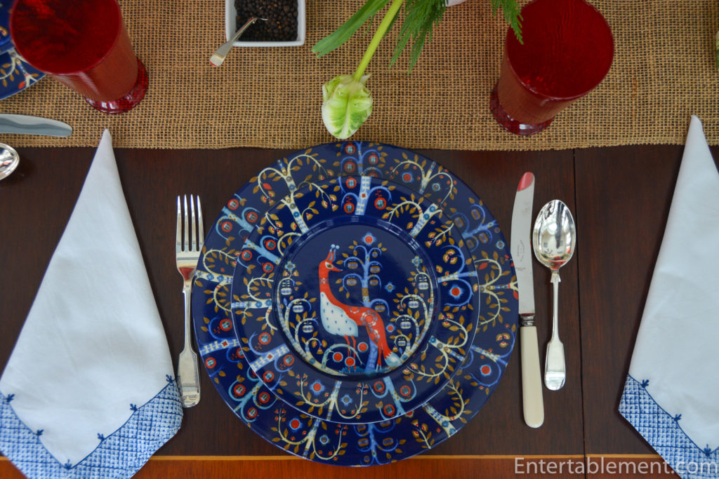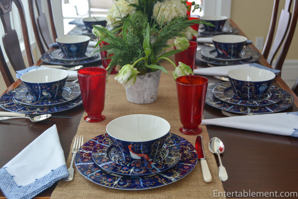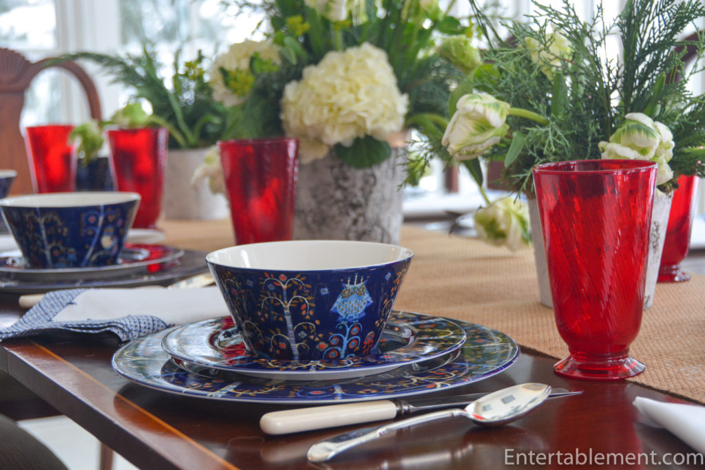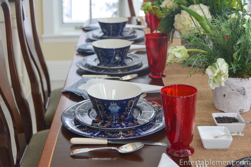 Love this striking rich cobalt blue pattern and all the whimsical animals. Nice pick with the red glasses. I think you need some more dishes!!! Pretty soon you’ll need a storage pod. The simple white flowers soften the tablescape and beautifully put together. What next?