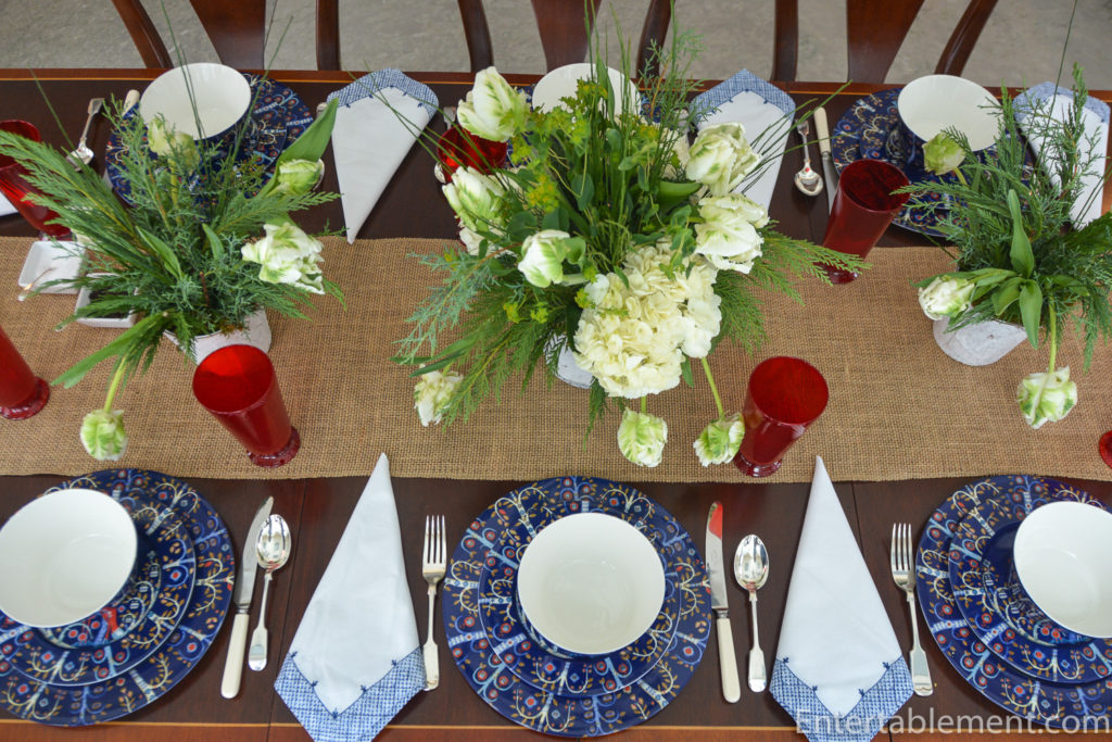 The accents on the set are mainly white with pale blue and touches of red. With so much going on in the pattern itself, I decided to stick with simple white floral arrangements.
