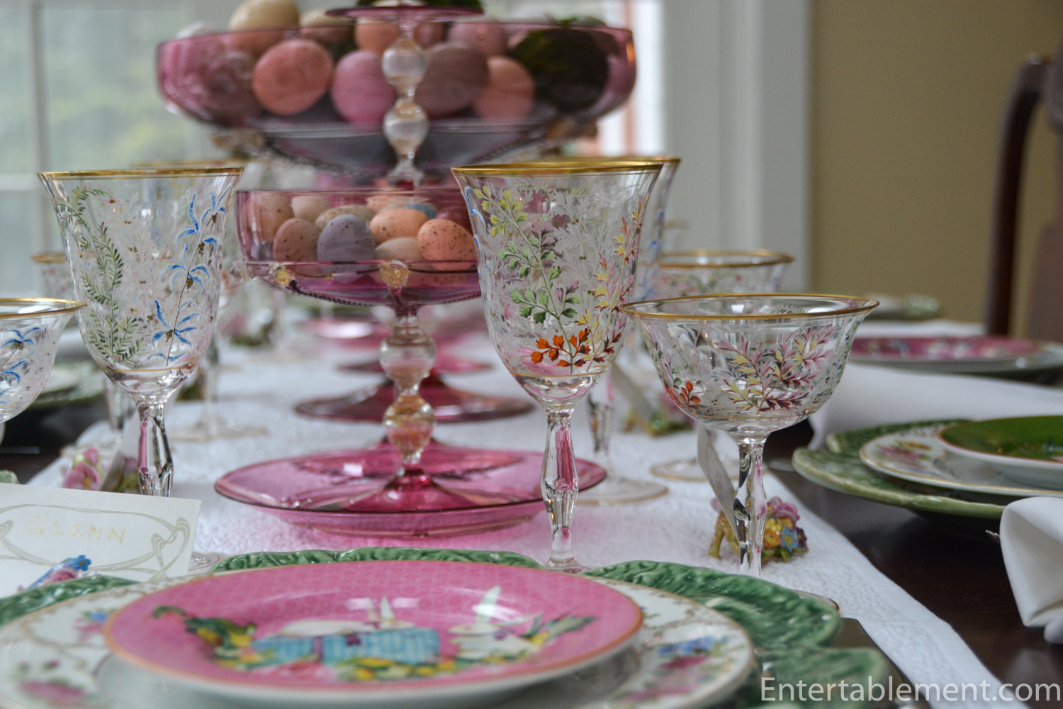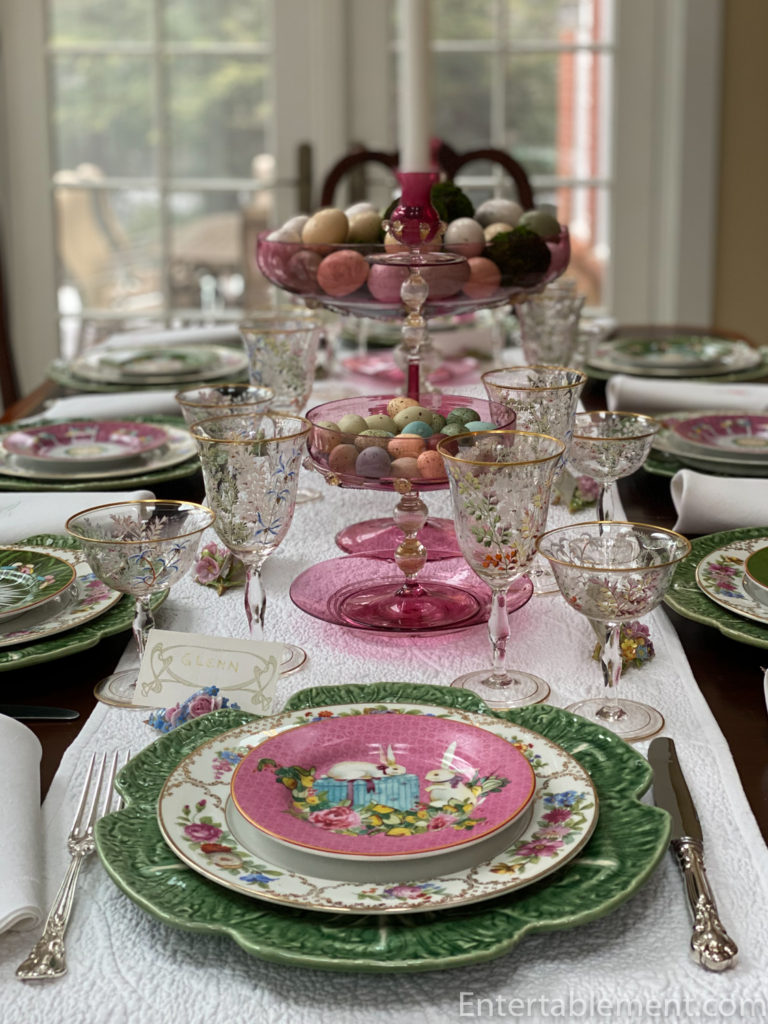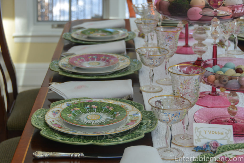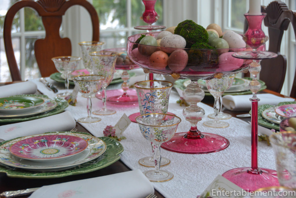 It’s a “posh” Easter table with antique Venetian glass compotes, candlesticks and hand-painted Moser goblets.