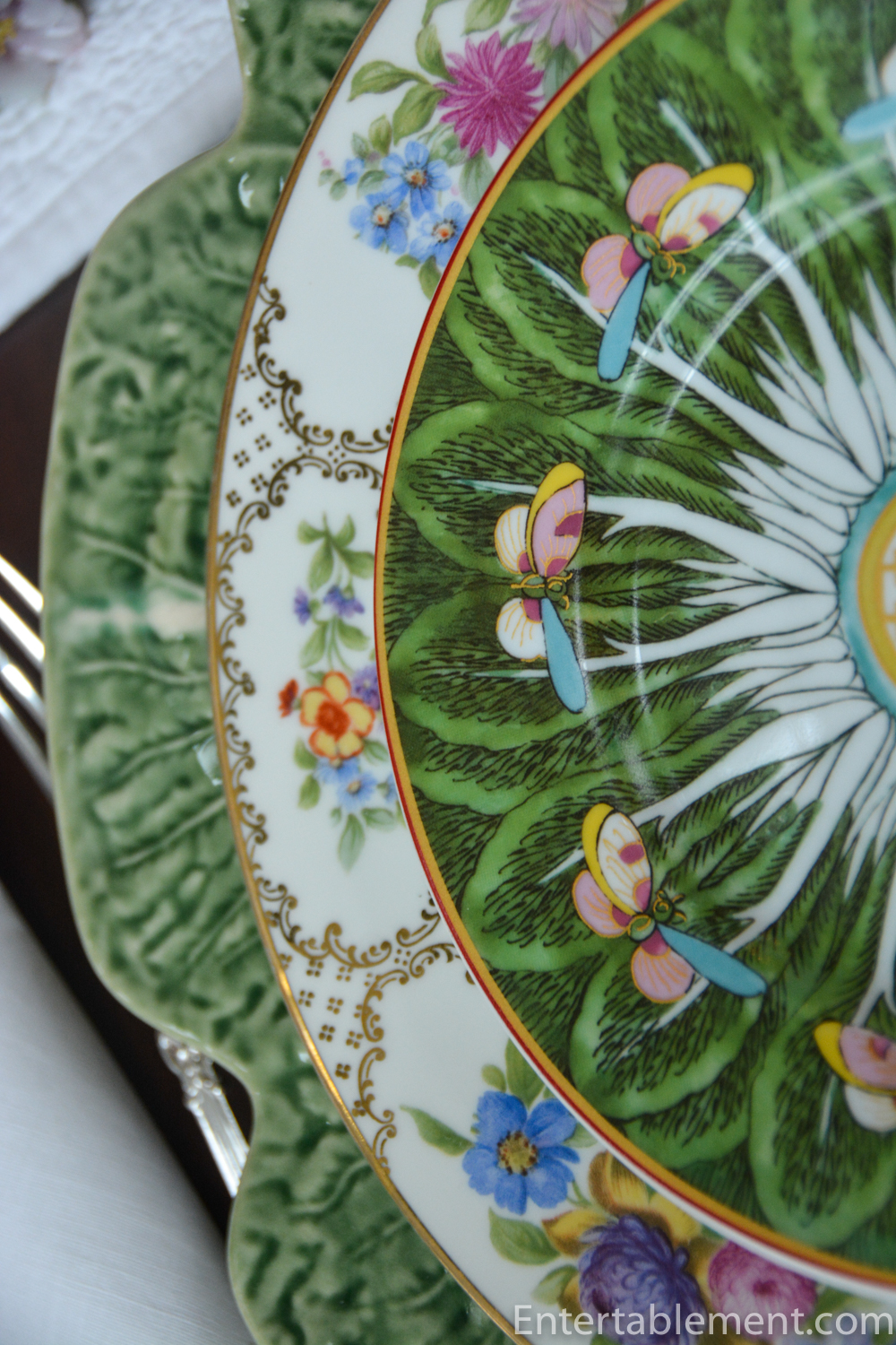 They sit happily on top of vintage Dresden Flowers luncheon plates by Schumann and Bordallo Pinheiro Cabbage pattern dinner plates.