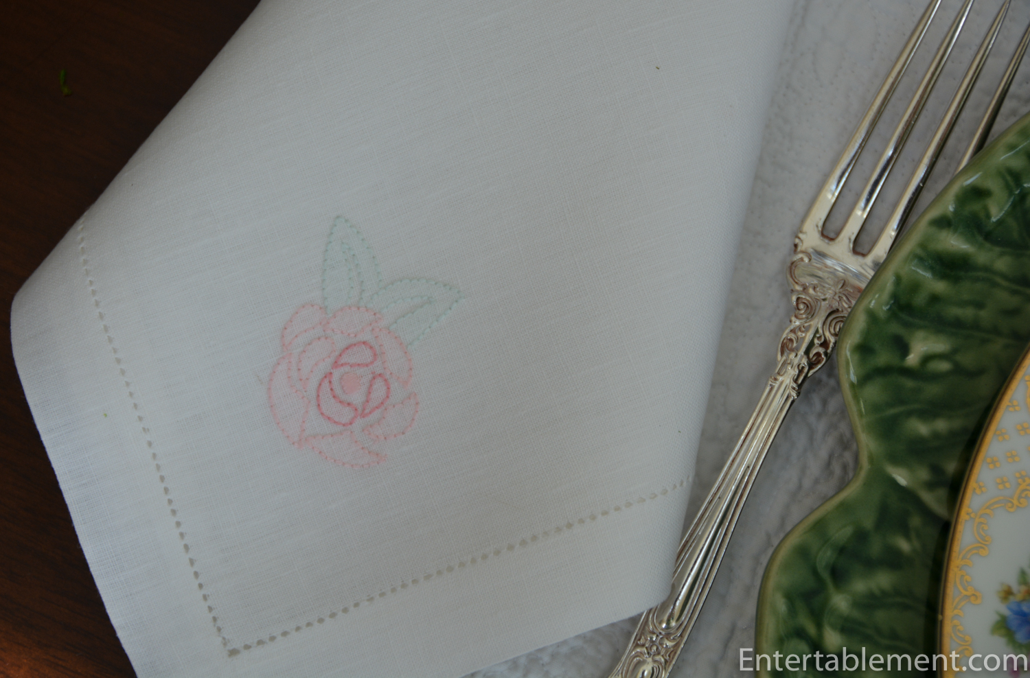 The napkins are part of a tablecloth/napkin set I picked up in Italy a few years ago. The soft pink embroidered roses coordinated well with the early spring table setting.