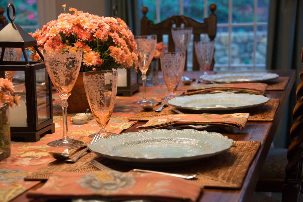 The blue Depression glass pattern is Cleo by Cambridge. It’s a tough one to track down, and I’ve been accumulating it a couple of pieces at a time. It was another good reason to set a table for four.